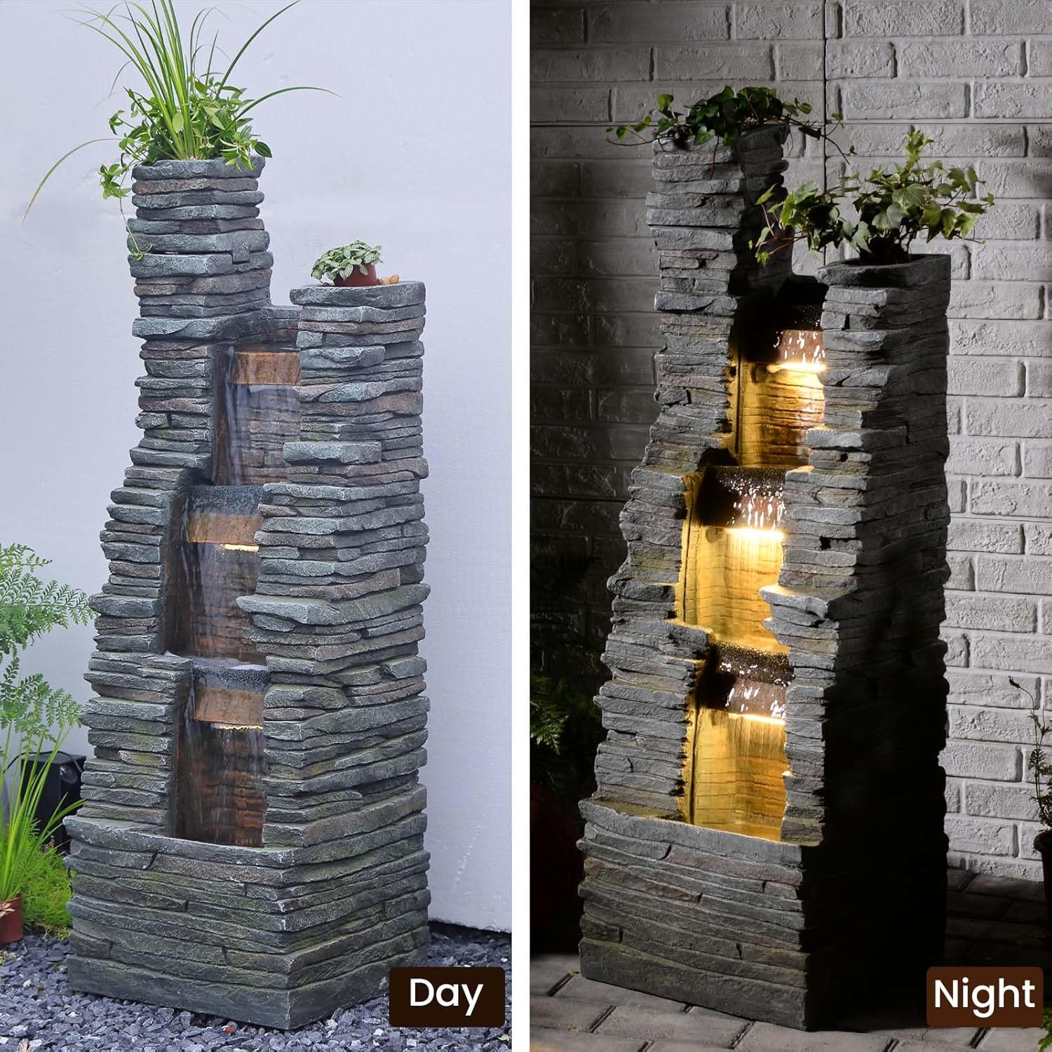 - 【Garden Fountain Information & Care】16.7"L x 11.42"D x 49.6"H Material: UV-stable resin Includes: Pump, LED lights.Pro Tip: Place on a level surface near a power outlet for optimal performance!