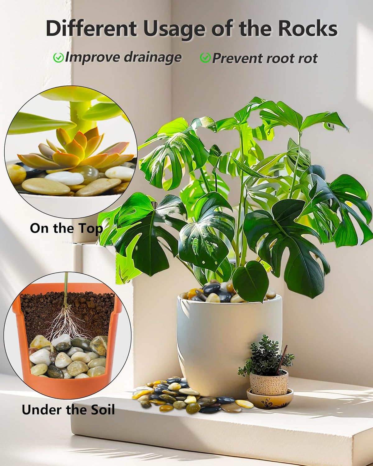- 【Pebbles for Plants, Succulents & Pots Top Dressing】 Provides a clean, appealing finished look to succulent arrangements, potted cactus, and indoor planters, perfect for improving appearance while also serving as drainage and soil cover. One 5LB pack can cover about 6 to 8 pots (6" size) depending on layout, each pot usually needs 10-12 pcs river rocks.