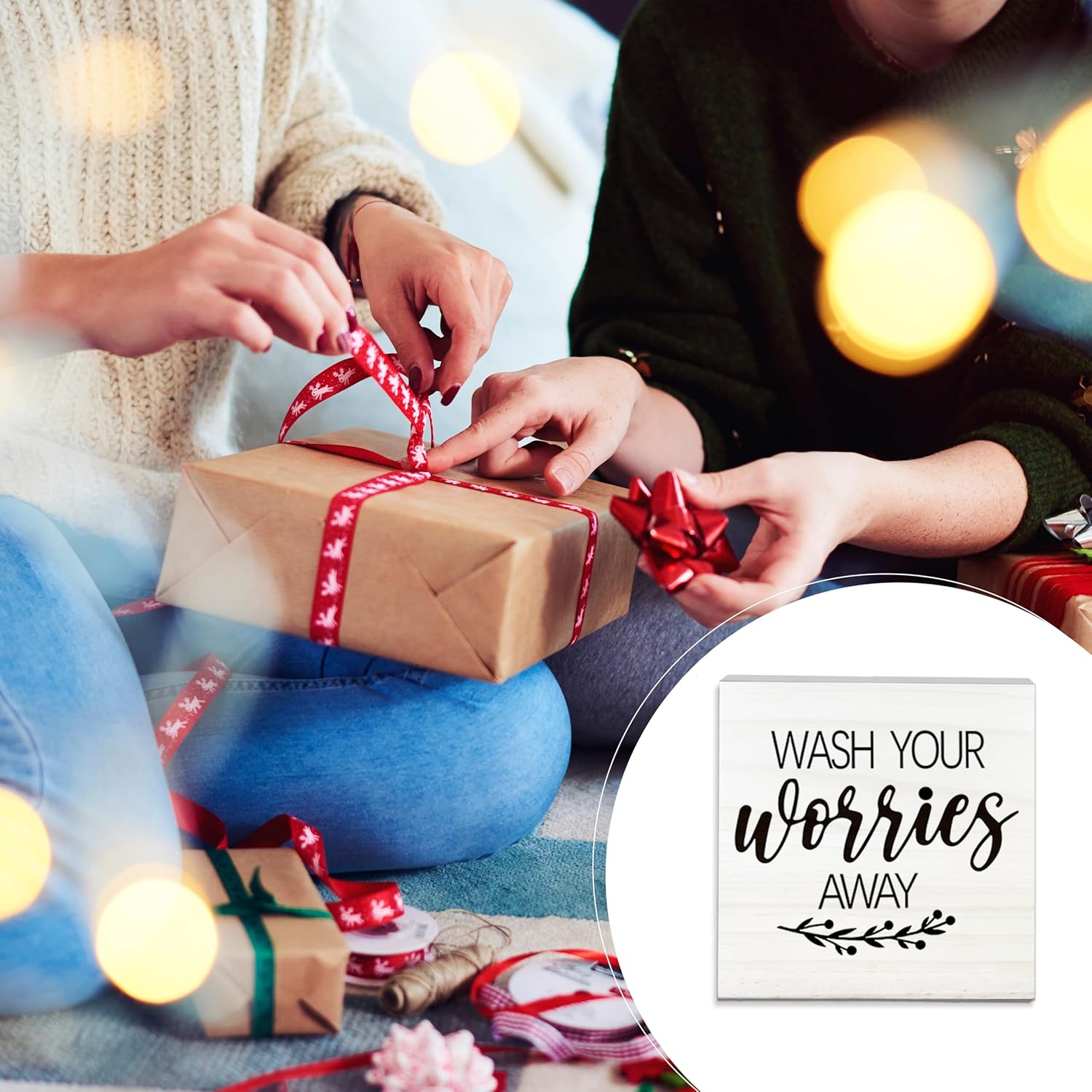 Wash Your Worries Away Wooden Sign - Funny White Block Plaque Desk Decoration-5x5 inches Inspirational Wood Block Gifts For Friends Family-Laundry Room Restroom Bathroom Tabletop Favors & Supplies-A01