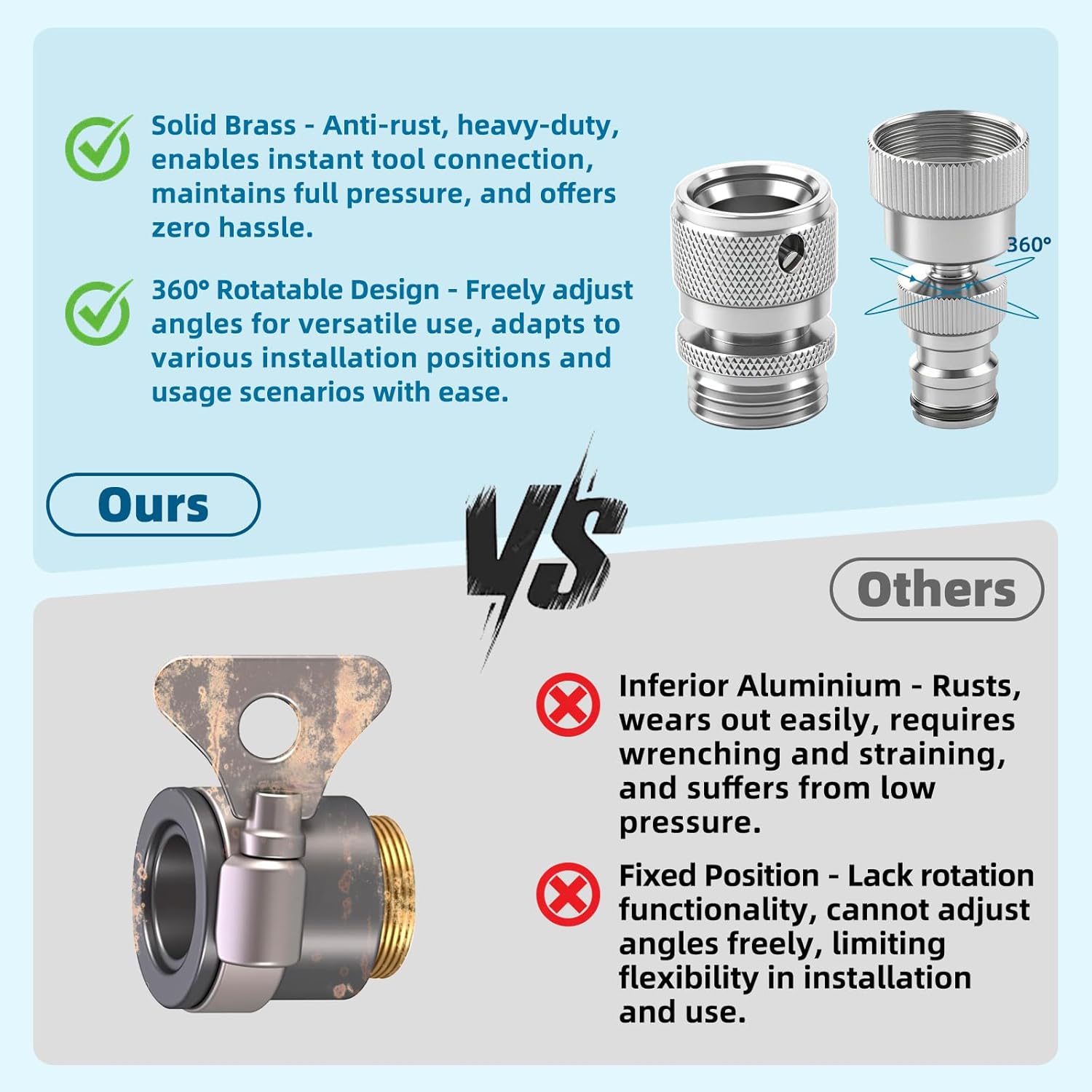 - 360° Free Rotation for Hassle-Free Use: Upgrade with 360-degree rotatable design, the connector allows the garden hose to swivel freely without kinking, twisting, or tangling—for watering plants, cleaning patios, or washing cars. No more stopping to adjust the hose direction, saving you time and effort