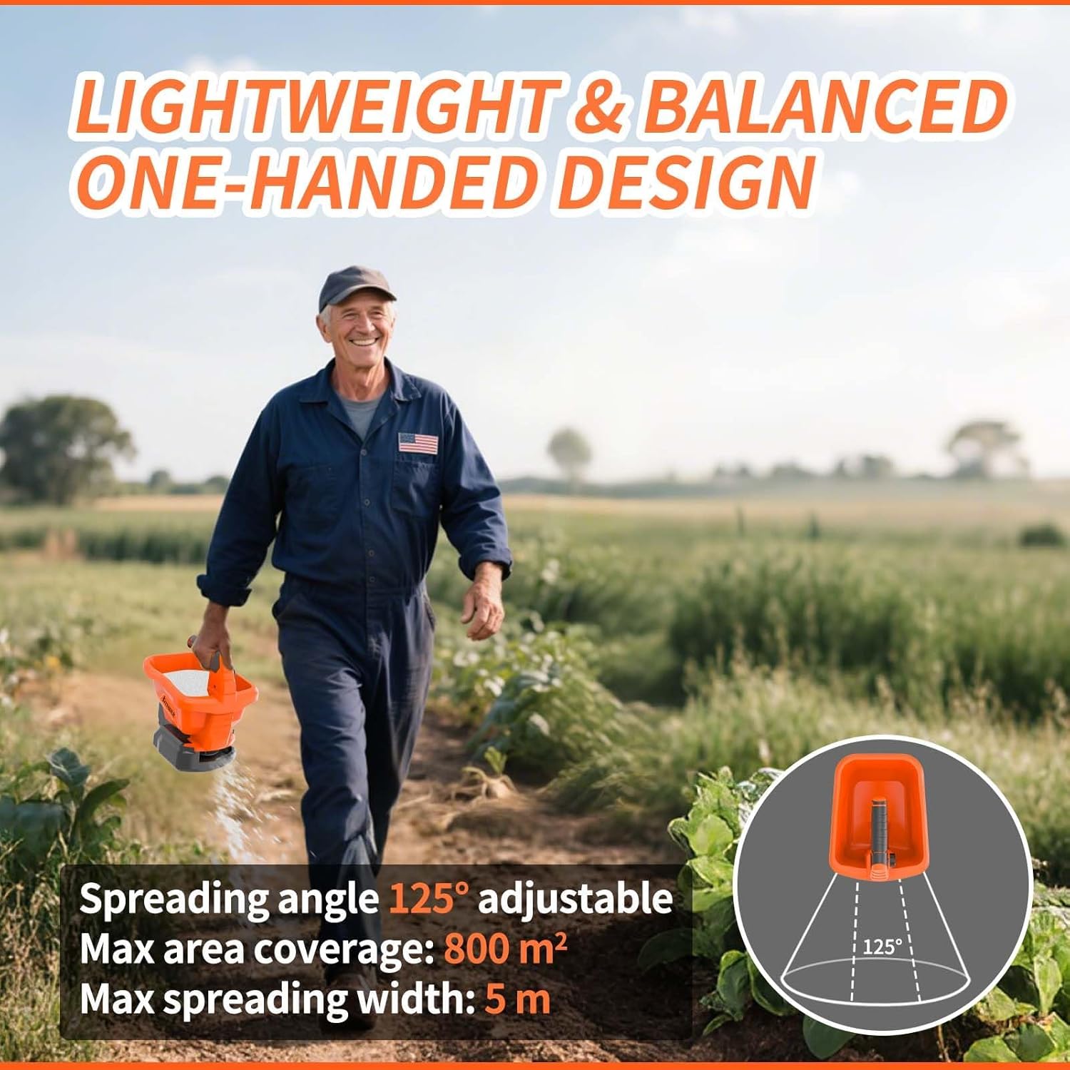 - 【High Capacity and Portability】With a 4L capacity and ergonomic design, this handheld broadcast spreader ensures convenience while carrying and using it, perfect for small or large lawns.
