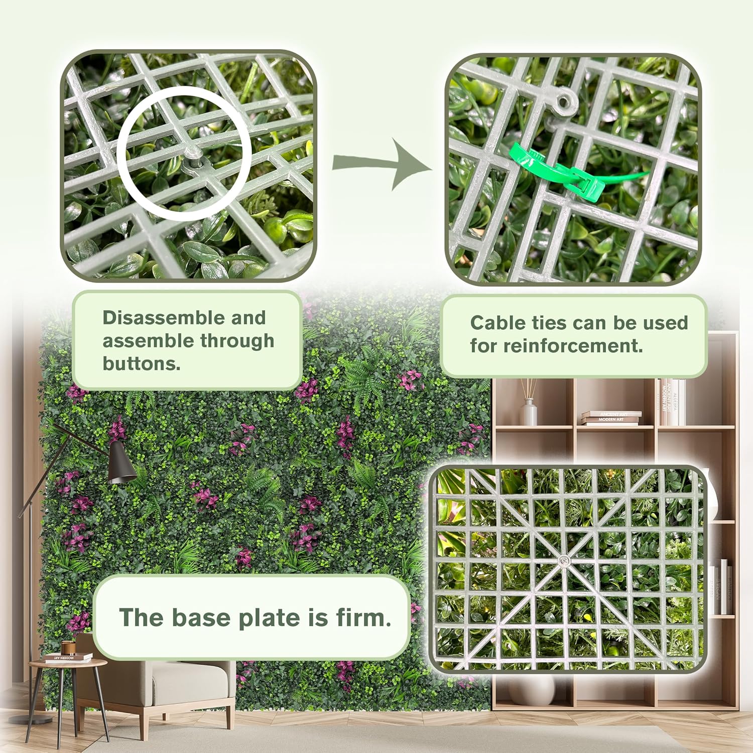 - 【Effortless setup】: The green Artificial Boxwood Hedge Panels roller blind features a permeable base. Can cover 33.5 square feet. 40 in * 120 in each. Have a 3D sense,The grass wall panel comes with 50 zipper strips, allowing for straightforward attachment to walls or fences. Each panel includes locking connectors for a hassle-free installation process. The base plate is both pliable and robust, enabling you to effortlessly trim it to your desired size using scissors or a utility knife.
