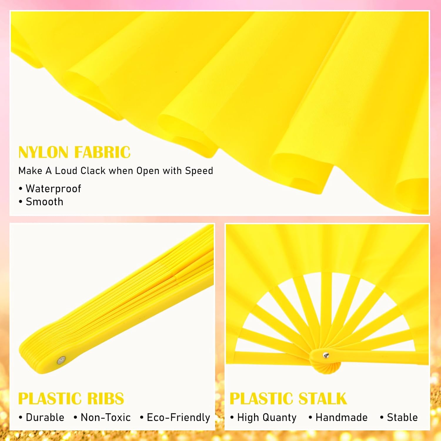 - Material and Measurement: made of quality plastic and pink and yellow nylon cloth, lightweight and sturdy fabric, and each fan measures approx. 13.4 x 25 inches/ 34 x 63.5 cm (L x W, unfold state)