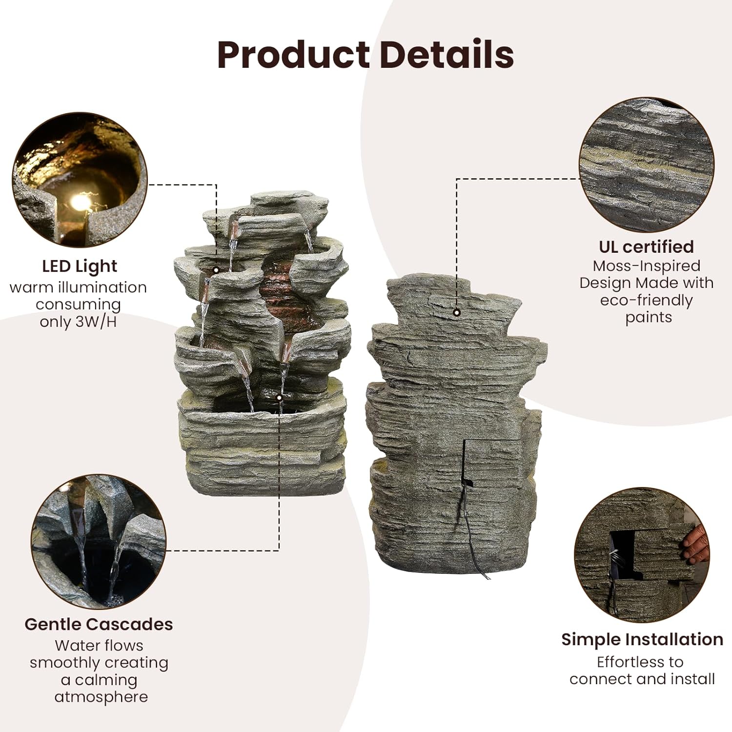 - DURABLE DESIGN: The fuente de agua para exteriores features a durable, expertly crafted design made from rust-resistant polyresin. Its realistic gray stone rock tower, accented with moss, brings a natural touch and enhances the space with artistic charm