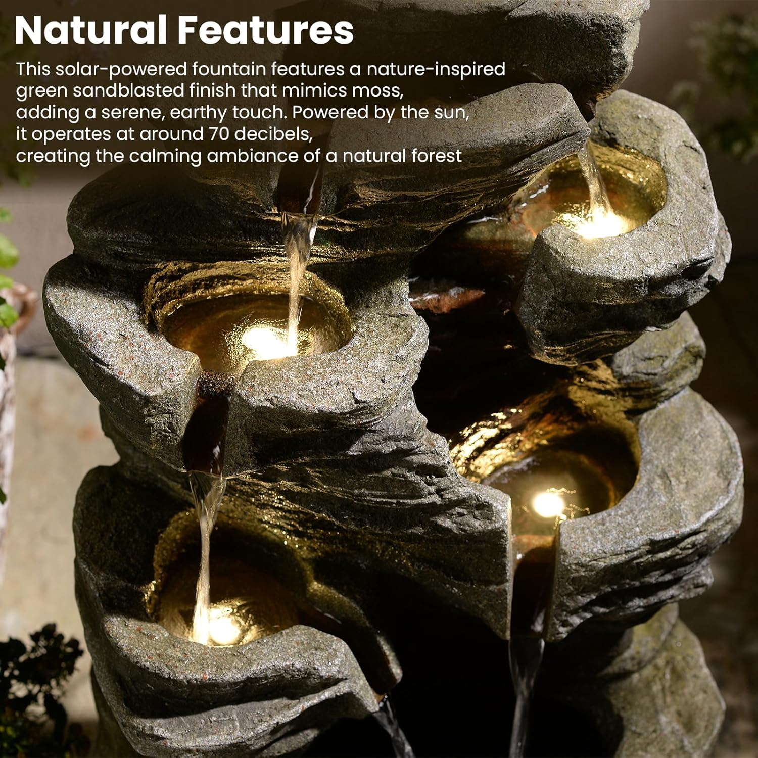 - GENTLE WATER FLOWING: The solar waterfall fountain allows water to gracefully flow down from five elegant spillways. The soothing sound of the waterfall reaches up to 70 decibels, effectively drowning out unpleasant and unwanted noises, allowing you to relax with its shimmering water display