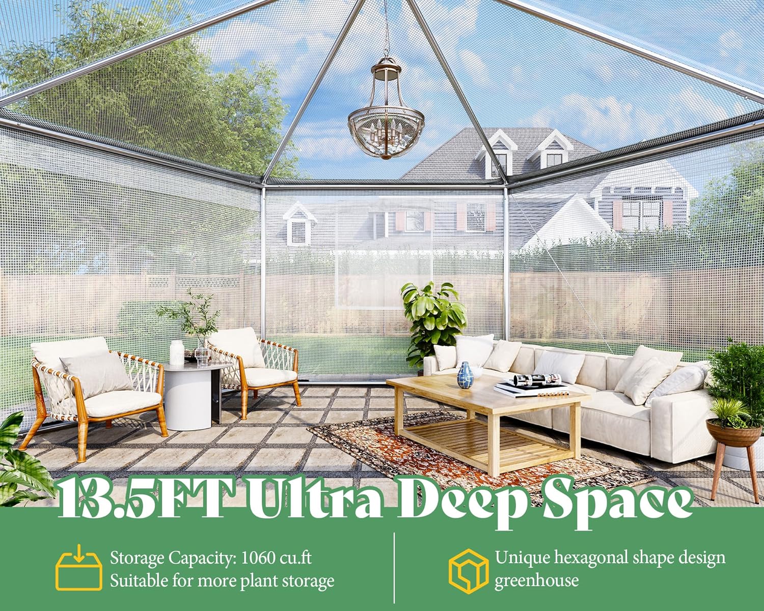 - Generous Planting Area: Enjoy the ample 13.5' x 13.5' dimensions and 9' height our greenhouse offers, the unique hexagonal shape maximizes space, making it ideal for shelving and hanging plants