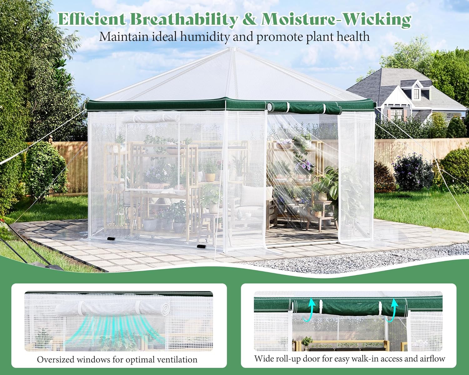AMERLIFE 13.5x13.5x9 FT Hexagonal Walk-in Greenhouse for Outdoors, Heavy-Duty Greenhouse with Windbreak Ropes, Waterproof PE Cover, Ground Stakes, Tunnel Green House for Garden, White/Green
