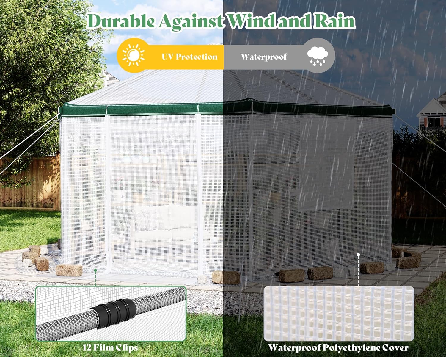 - Durable Against Wind and Rain: Boasting a unique hexagonal shape, sturdy all-metal frame and waterproof polyethylene cover, this walk in greenhouse resists harsh weather conditions, including strong winds and heavy rain