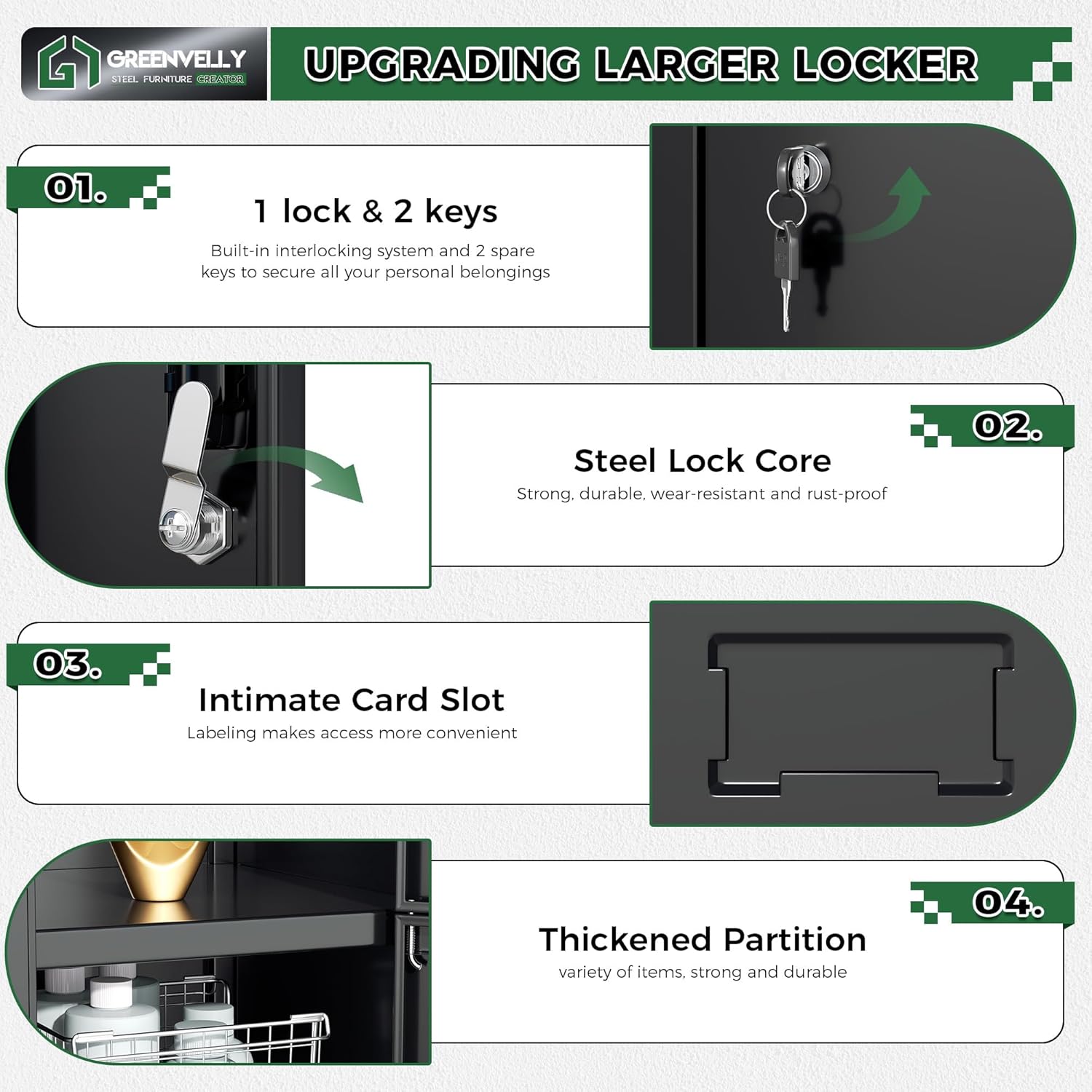- 【Detail design】 Greenvelly metal locker features an innovative ventilation door design that cleverly emits odors. With our clever card slot function, it can help you quickly and easily find the items you need in a short period of time. In addition, the interior handle design on the cabinet door makes it easy and convenient for you to open and close the door.
