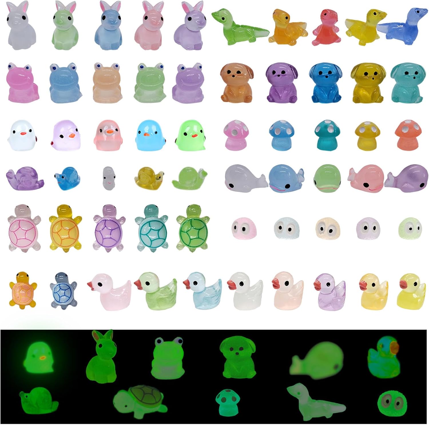 60pcs Mini Resin Animals Luminous Tiny Small Animals Figures Variety Pack Glow in The Dark Ducks Rabbits Ect 11 Type Little Figurines to Hide for Miniature Landscape Potted Fairy Garden & Aquarium