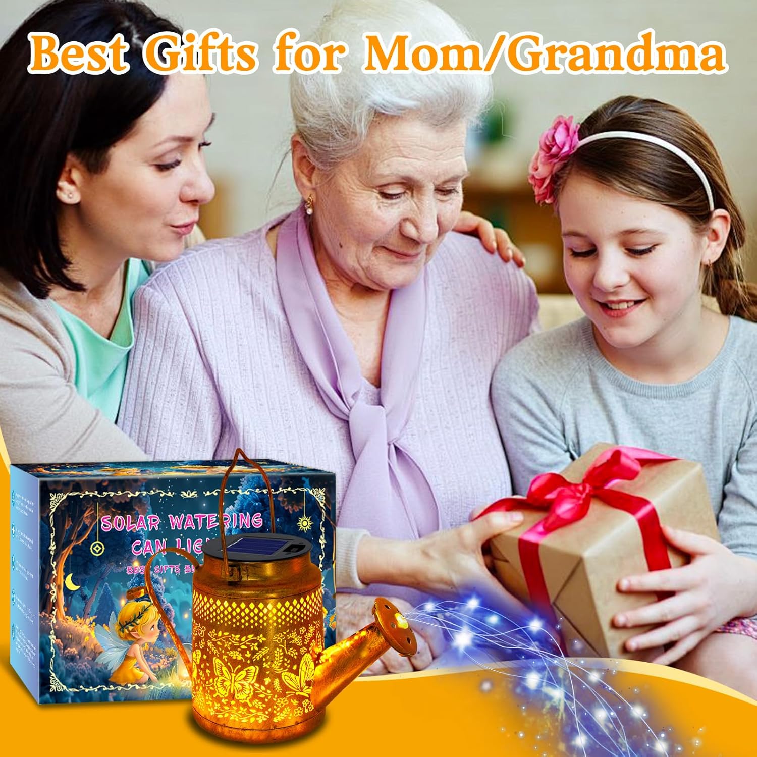 - Mom Gifts Solar Garden Lights -- This solar watering can with cascading lights is a perfect decoration for garden, yard, lawn, porch, patio, pathway, walkway, terrace, and balcony. You can place this outdoor decor for patio on the ground with the included Shepherd Hook to decorate your plants, vines, flower bed, or just hang it on a tree or placed on the tabletop
