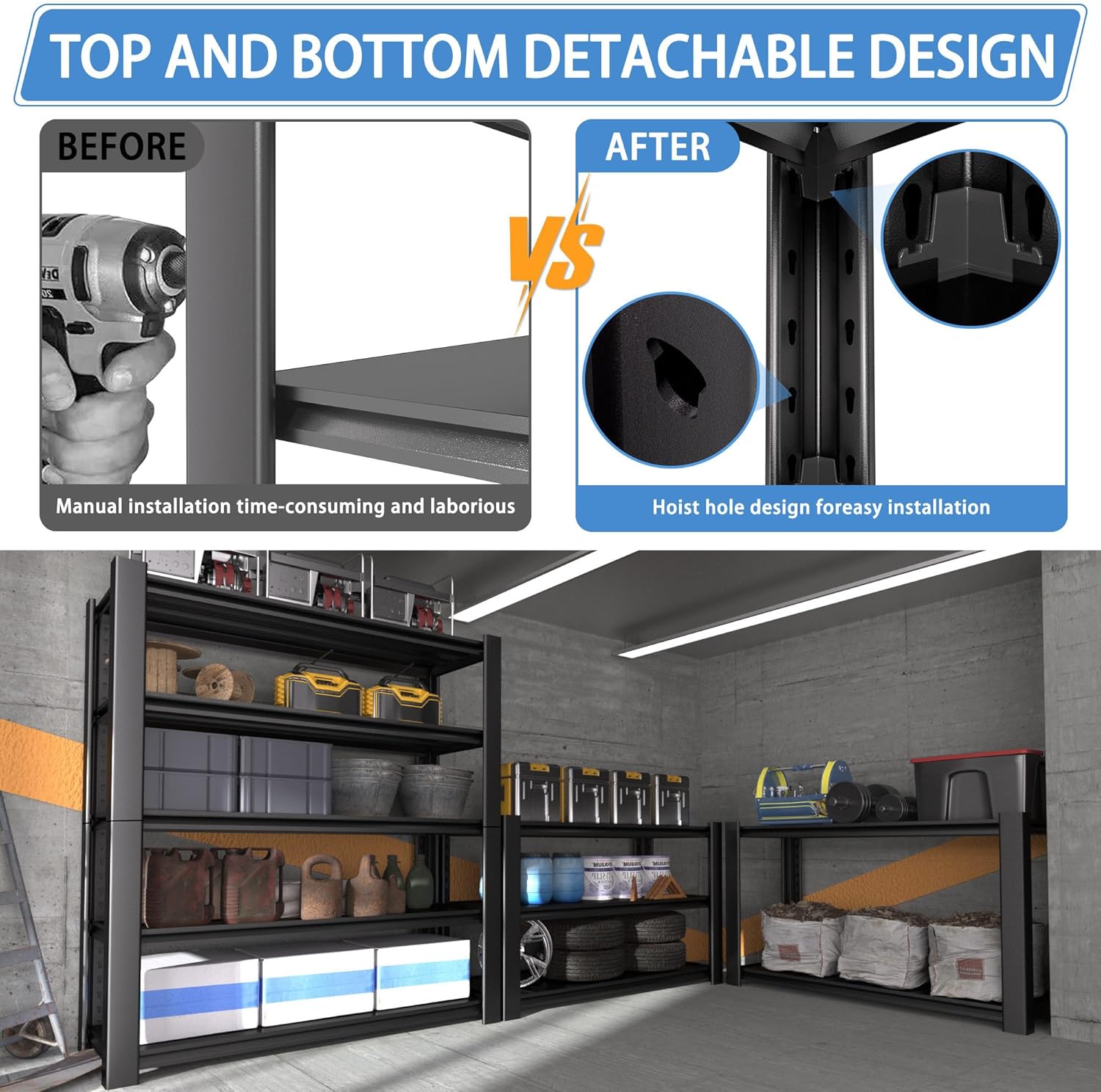 - Heavy-Duty Steel Construction & High Capacity: Built with industrial-grade metal, the NEXVRTAU shelving unit supports extreme loads on each of its 5 tiers. The heavy-duty steel frame and reinforced beams provide stable storage for tools, equipment, and bins – perfect for garages, warehouses, or any space demanding reliable strength.