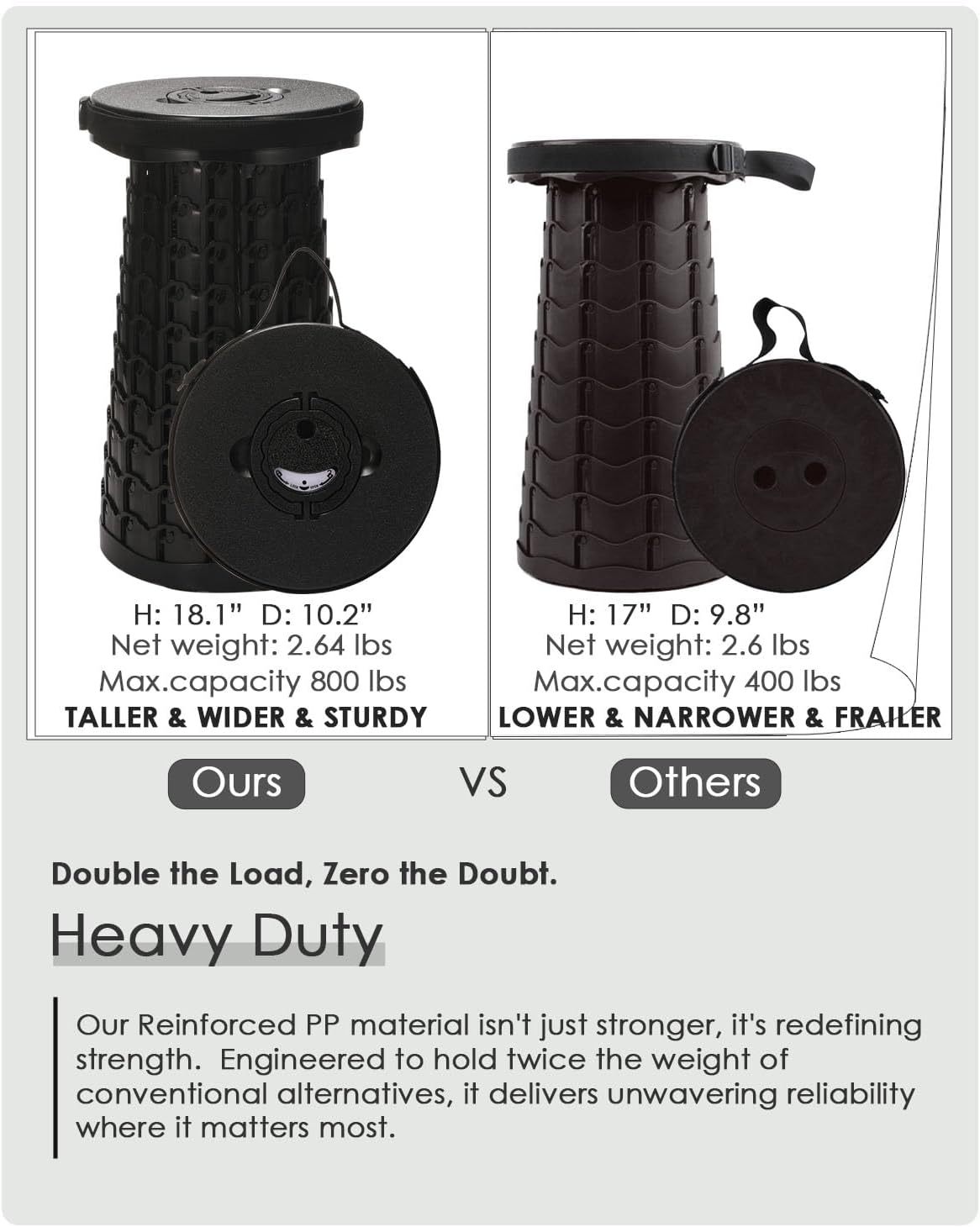- 800 LBS HEAVY-DUTY CAMPING STOOL – Reinforced PP material, delivers double the industry strength, creating ultra-safe portable stools for adults of most sizes.