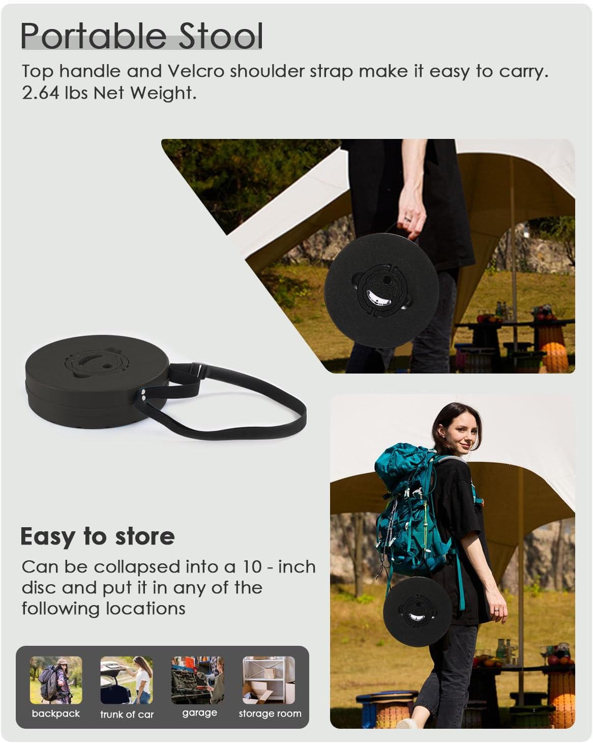 - LIGHTWEIGHT PORTABLE FOLDING STOOL – Only 2.64lbs! Folds compact to 10.2"(D)x2.6"(H) with handle & shoulder strap. Perfect lightweight collapsible stool for backpacks or car trunks.