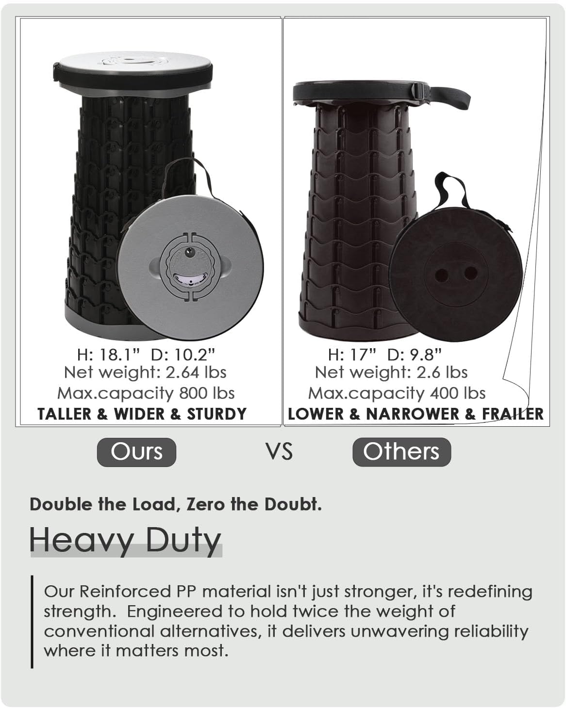 - 800 LBS HEAVY-DUTY CAMPING STOOL – Reinforced PP material, delivers double the industry strength, creating ultra-safe portable stools for adults of most sizes.
