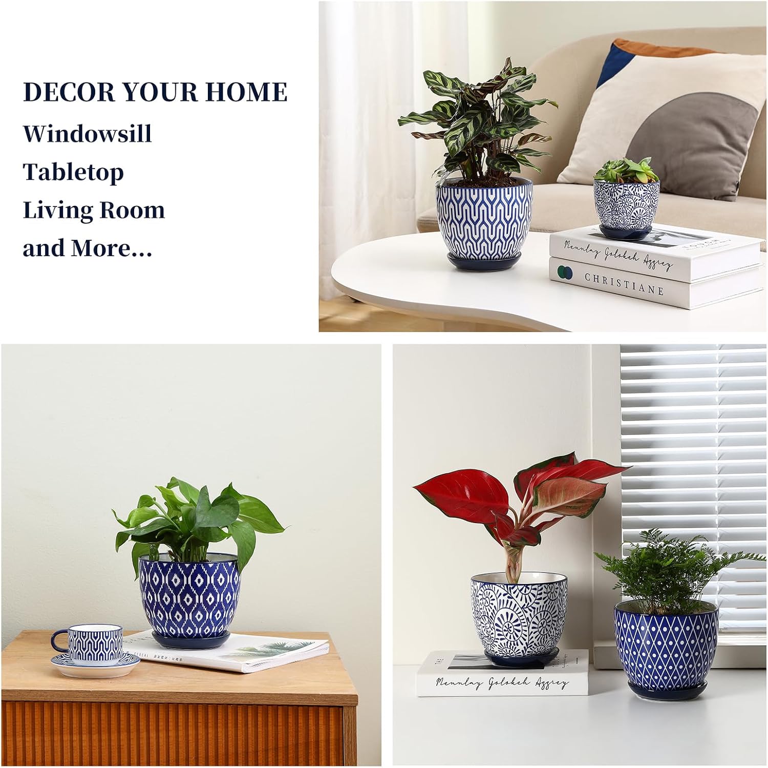 Selamica Ceramic Plant Pots, 5.6 Inch Flower Pots for Indoor Plants with Drainage Hole and Saucer,Home Decor, Set of 4, Vintage Blue
