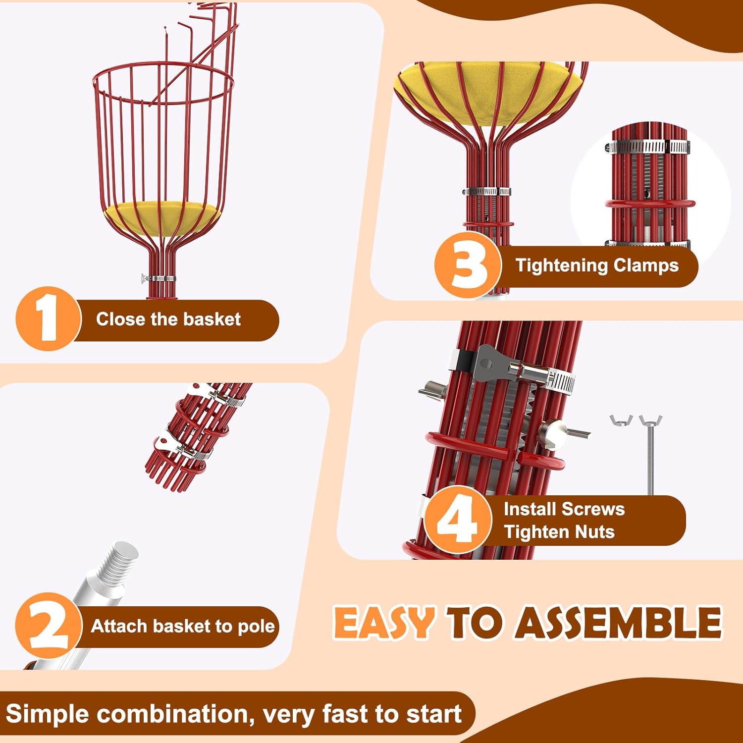 - Easy Assembly & Use: Assembly is a breeze with just a few simple steps. You can quickly attach the fruit picker pole with basket telescoping securely to the fruit picker pole without the need for additional tools, allowing you to focus more on harvesting. Whether you're an apple picker pole with basket user or a mango picker enthusiast, this feature saves you time and effort.