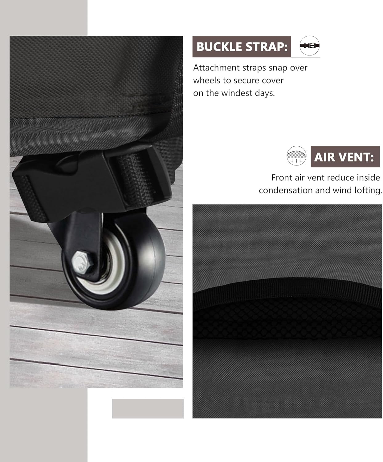 - Well-made structured air vents keep ventilation, prevent the cover from being blown away, also keep your grill equipment dry and in good condition.