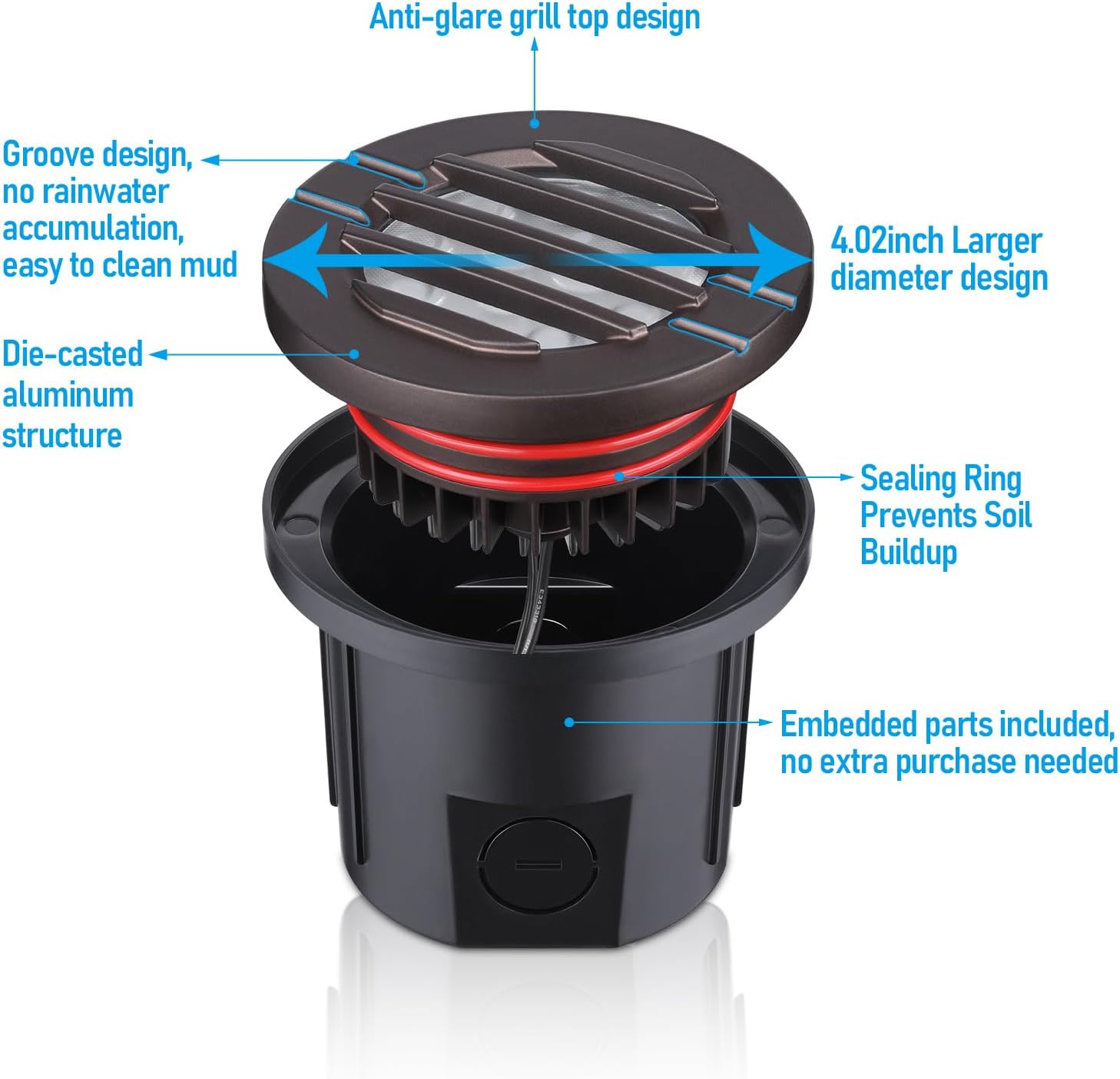 - Safe for Outdoor Use: Die-casted aluminum housing makes this led in-ground light has perfect corrosion resistance and heat dissipation. IP67 waterproof and -4℉-104℉ working temperaturemakes it can work under harsh weather