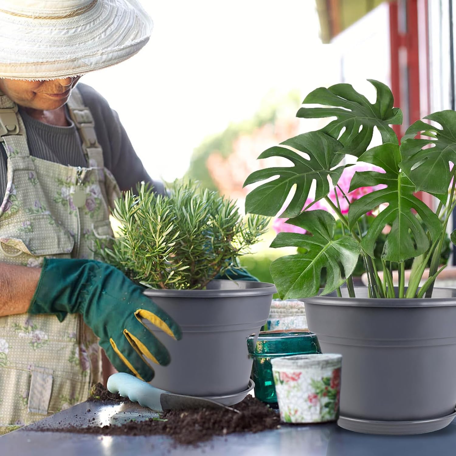- 【Multi - Usage】Designed for versatile use, coming in various size, plastic planters for outdoor plants are perfect for cultivating flowers, herbs, and vegetables, such as Bird of Paradise, Serpentine Moonflower, Majesty Palm, Succulents. These outdoor flower pots set is a perfect gift for your elders, friends and some other who like to decorate garden to enjoy the planting process. Plant pots outdoor is suitable for weddings, birthday, party, anniversary, Christmas, thanksgiving.
