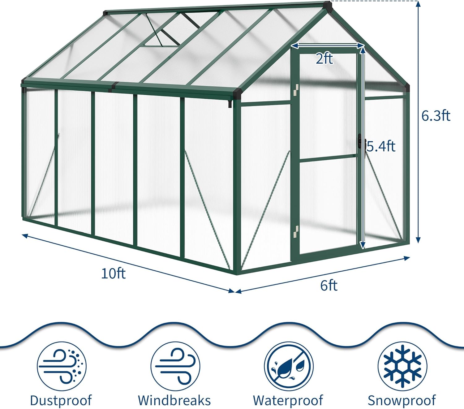 - 【Resilient Construction】Designed to endure challenging weather, our greenhouse features 720g/m² polycarbonate panels and a solid aluminum steel frame. This design ensures stability and protection during heavy rain and gale. Keep your plants safe and thriving in a reliable greenhouse built to last.