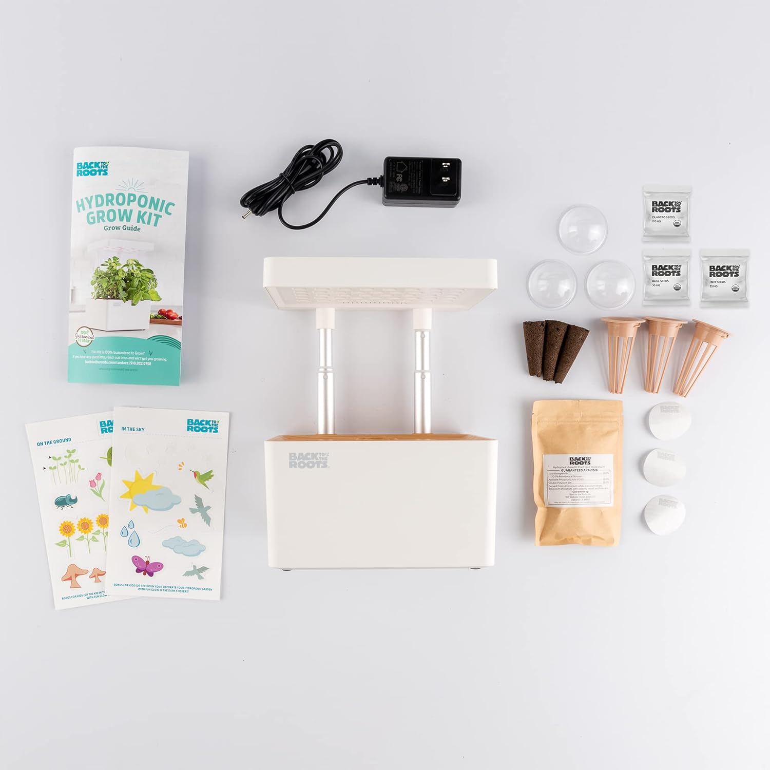 - COMPLETE COUNTERTOP GARDEN: This hydroponic system comes with everything you need to grow. Inside is a 3-pod grow system, automatic LED light, telescoping poles, grow medium, humidity germination domes, water level indicator, easy to use pre-portioned plant food, STEM gardening curriculum, fun stickers for kids, and a 100% Guaranteed to Grow promise! And the best part? It's made using recycled plastic — over 60 water bottles worth!