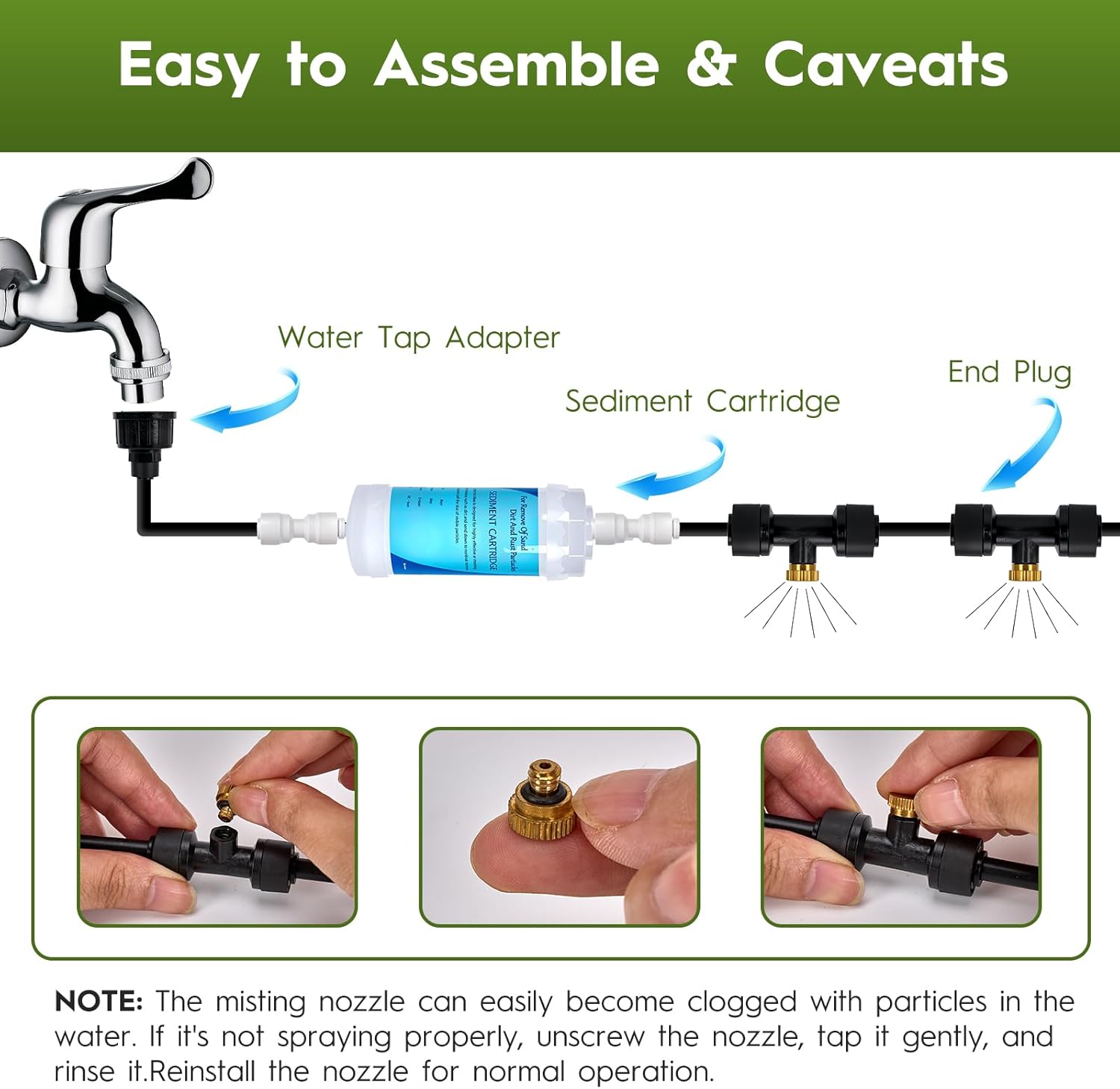 - Advanced Filtration & Clog-Free Design - Every kit includes a built-in filter to remove impurities, reducing nozzle blockage by 80% and extending system lifespan. Breathe easy knowing your misters stay clear, whether cooling kids on a trampoline or nurturing delicate herbs