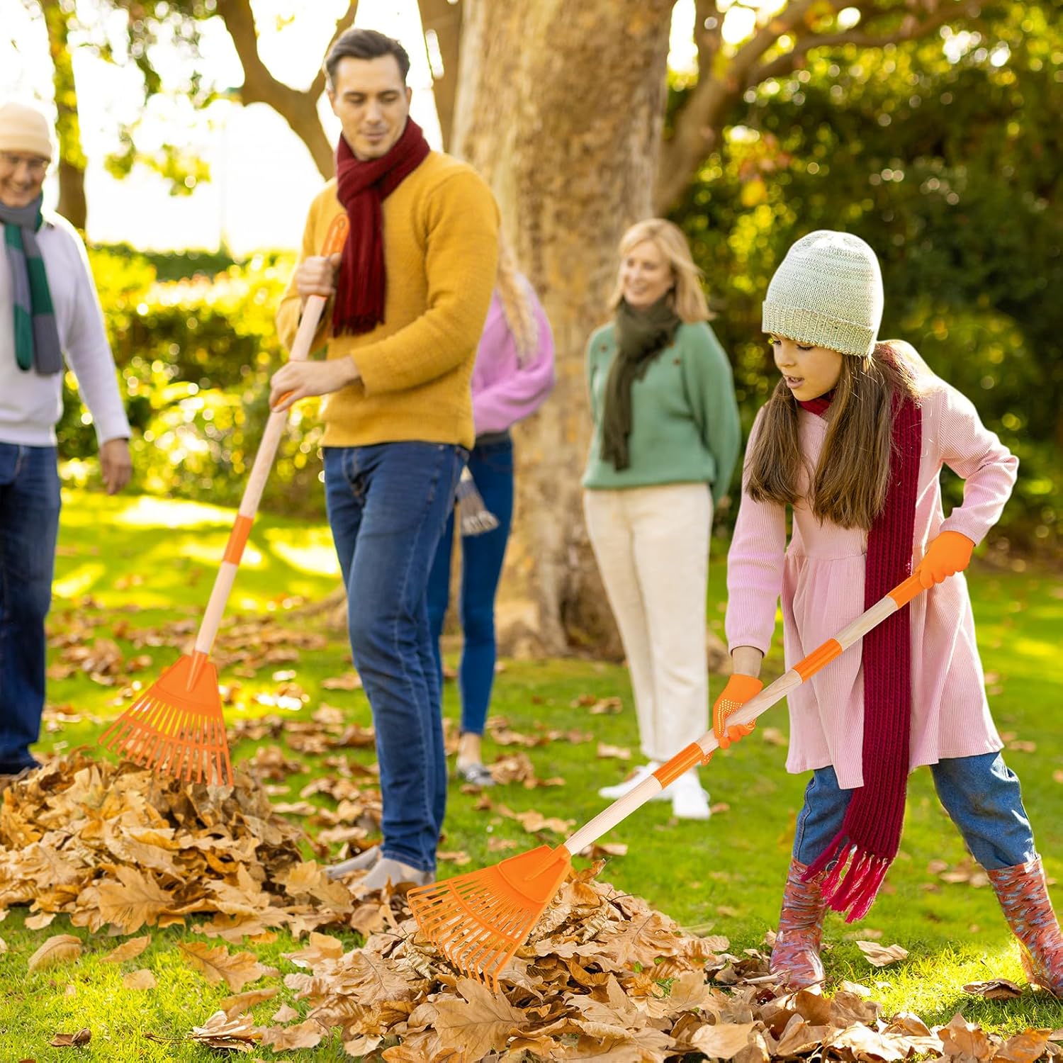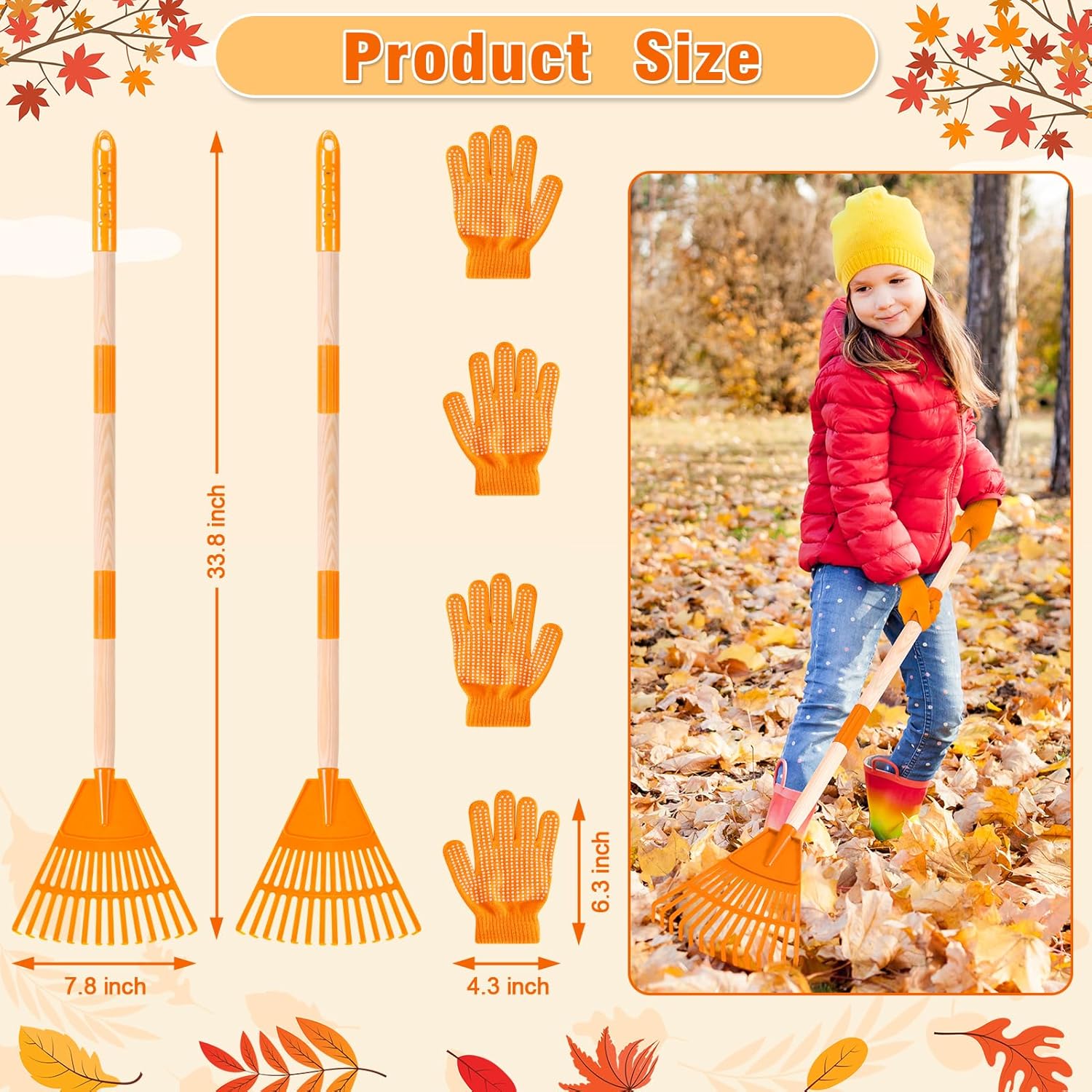 4 Pcs 35'' Kids Rakes for Leaves - Plastic Rake Head with 4 Pairs Kids Gloves, Small Kids Lawn Rakes Detachable Wooden Handle, Autumn Garden Tool Set for Kids Boys and Girls, Orange, 3yr+