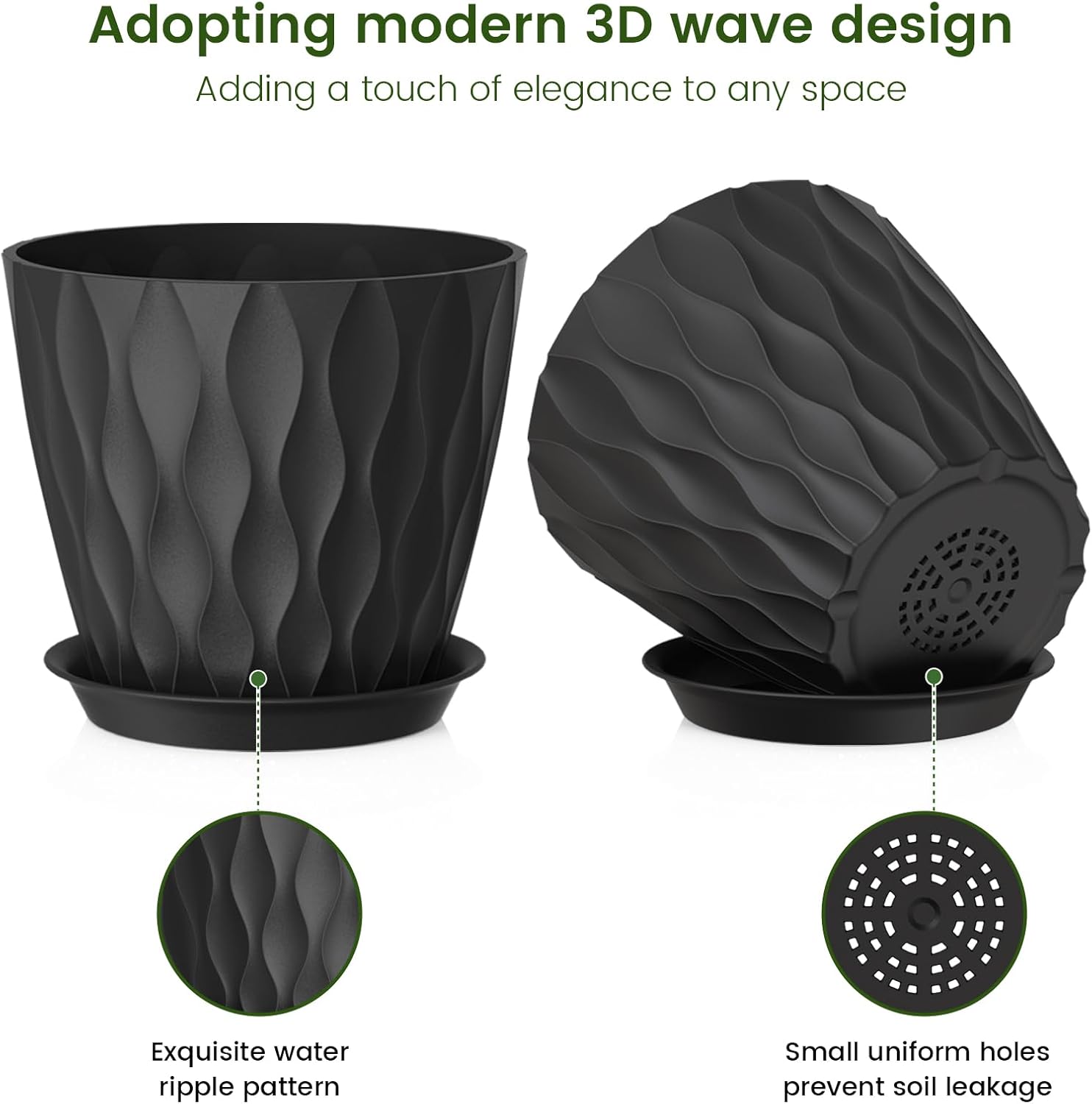 7 inch Plant Pots for Indoor Outdoor Plants, 5 Pack Thick Nursery Pots with Drainage Holes and Saucers, 3D Modern Wave Texture Plastic Planter Pots for Flowers and House Plants, Black