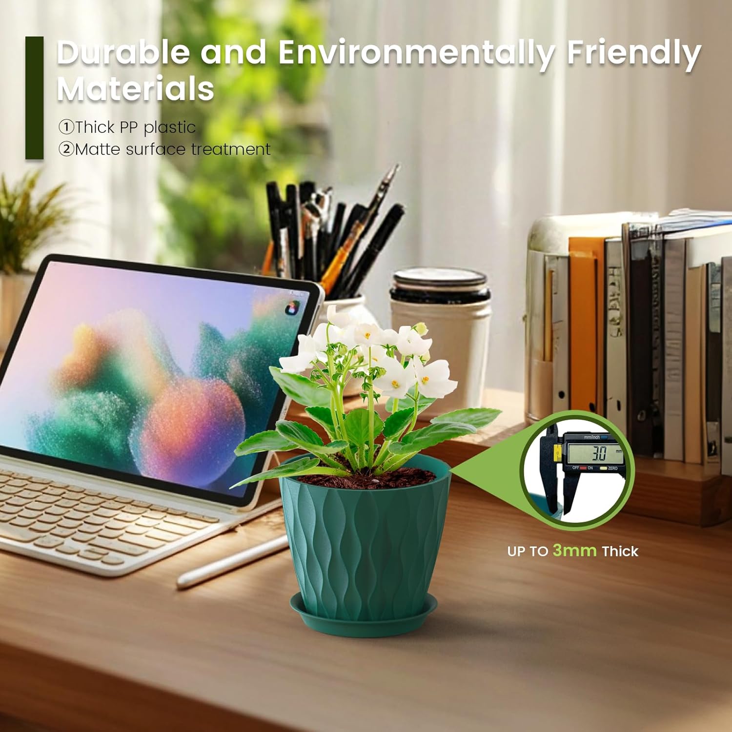 5 inch Plant Pots for Indoor Outdoor Plants, 6 Pack Flower Pots with Drainage Holes and Saucers, 3D Modern Wave Texture Small Plastic Planter Pots for Nursery and House Plants, Blue Green