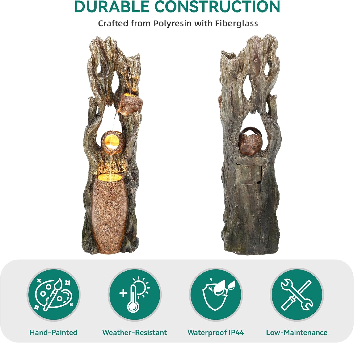 - Relaxing Water Flow: Immerse yourself in the soothing sounds and captivating sight of cascading water flowing between trunks and pots with this outdoor fountain, creating a peaceful retreat for meditation, relaxation, or unwinding after a long day.