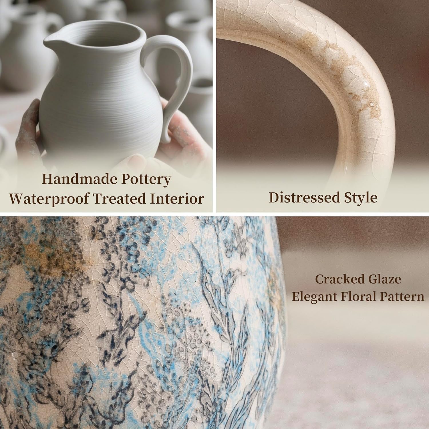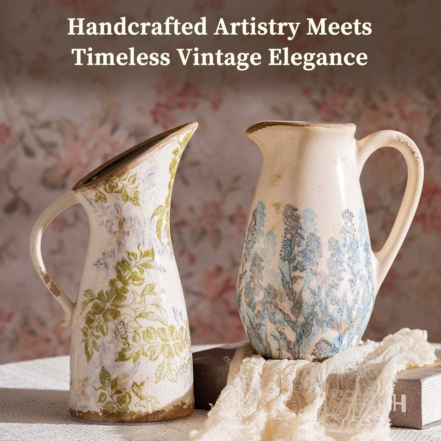 - Handcrafted Vintage Floral Pitcher Vase: Experience timeless charm with this ceramic vase featuring delicate light blue and navy floral motifs on a warm beige base. Inspired by classic Chinoiserie decor and farmhouse aesthetics, its elegant pitcher shape embodies authentic vintage home decor.