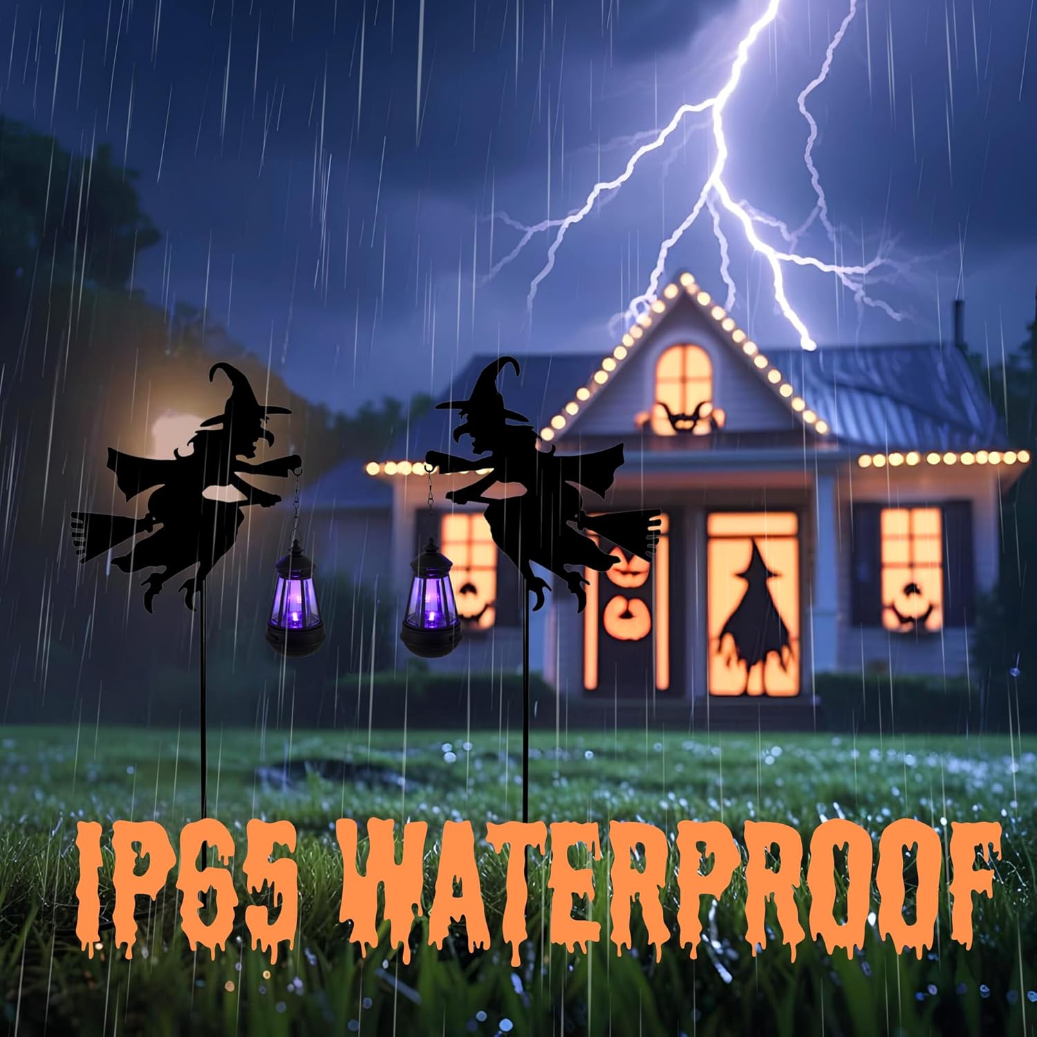 - 【 Outdoor Halloween Decorations Witch Figurines 】Light up your yard with spooky charm using this 2-pack of Halloween solar lights outdoor. Each metal stake features a detailed witch figurine in black holding a glowing purple lantern ( 39 inch tall ) , making them perfect Halloween decorations outdoor to elevate your lawn, garden, or walkway with eerie style.