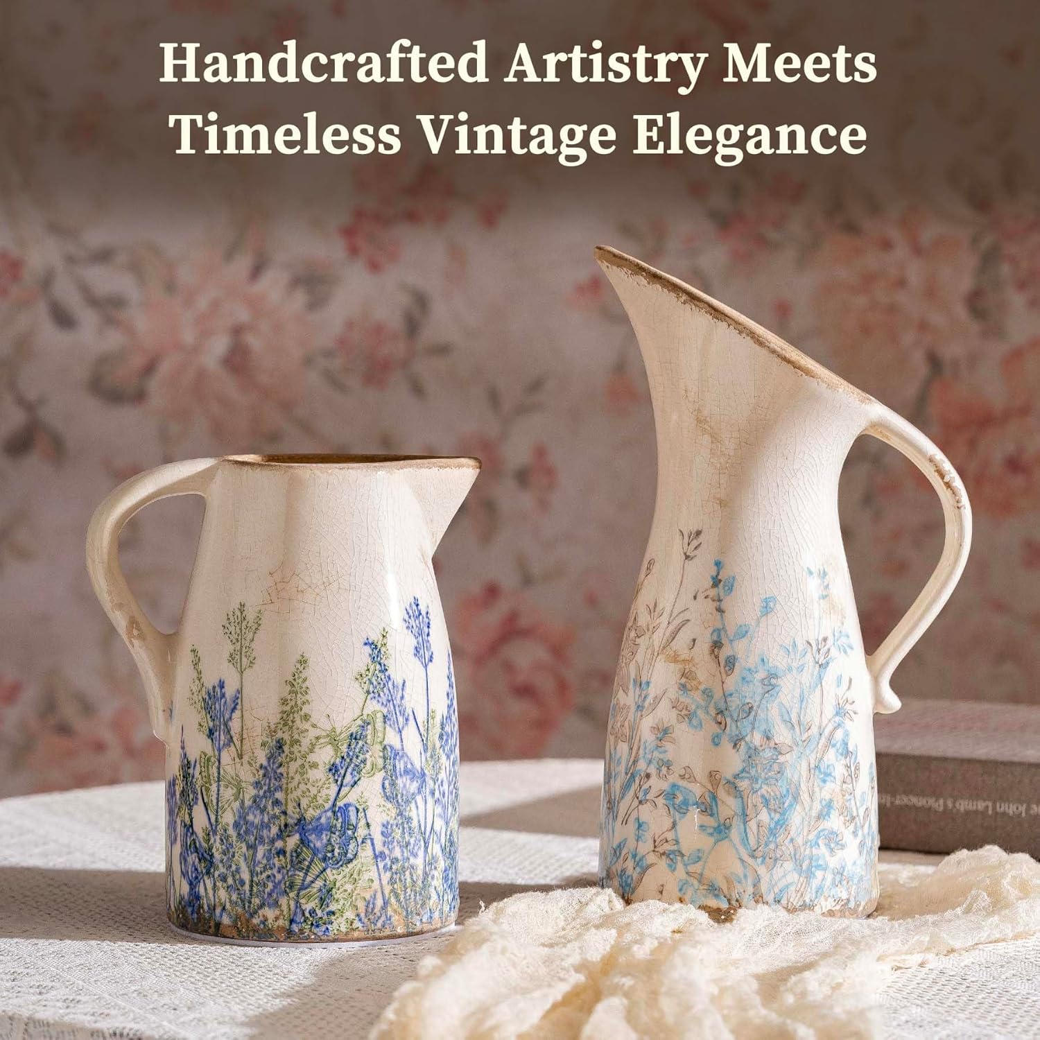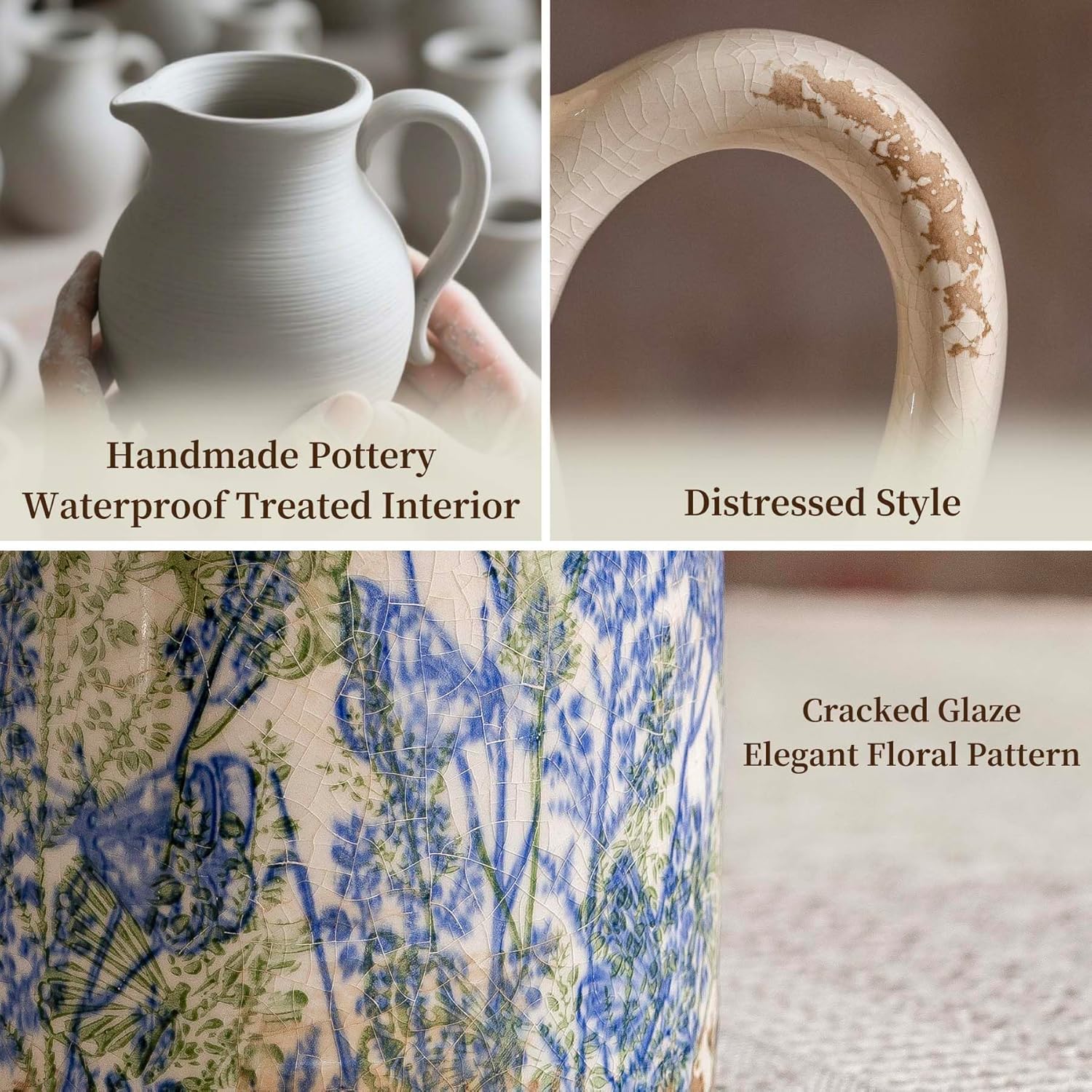 - Handcrafted Blue Floral Pitcher Vase: SURE YUESI's ceramic vase showcases delicate light blue and navy floral motifs on a creamy beige base, embodying vintage farmhouse charm with Chinoiserie-inspired artistry. The pitcher vase silhouette elevates classic floral vase designs for timeless vintage home decor.