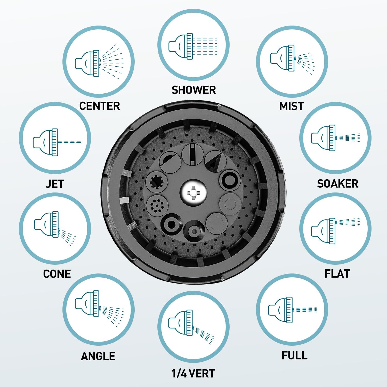 - 10-VERSATILE SPRAY PATTERNS: Precisely engineered to offer ten distinct spray functions: Full/Center/Jet Mist/Shower Soaker/Cone Angle/Flat ¼ Vertical Easily switch between patterns to handle everything from delicate seedlings to heavy-duty cleaning.