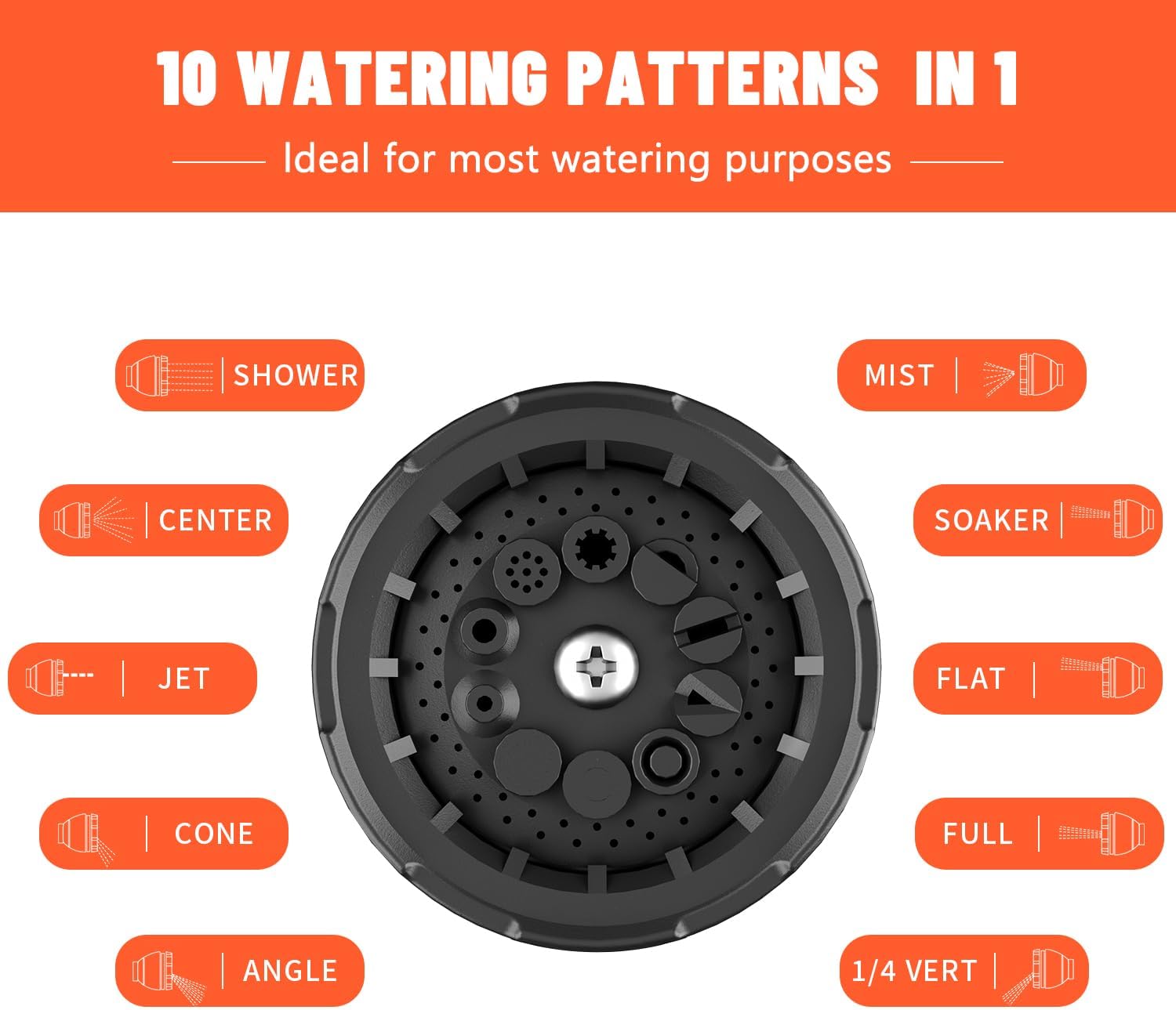 - 10-VERSATILE SPRAY PATTERNS: Precisely engineered to offer ten distinct spray functions: Full/Center/Jet Mist/Shower Soaker/Cone Angle/Flat ¼ Vertical Easily switch between patterns to handle everything from delicate seedlings to heavy-duty cleaning.