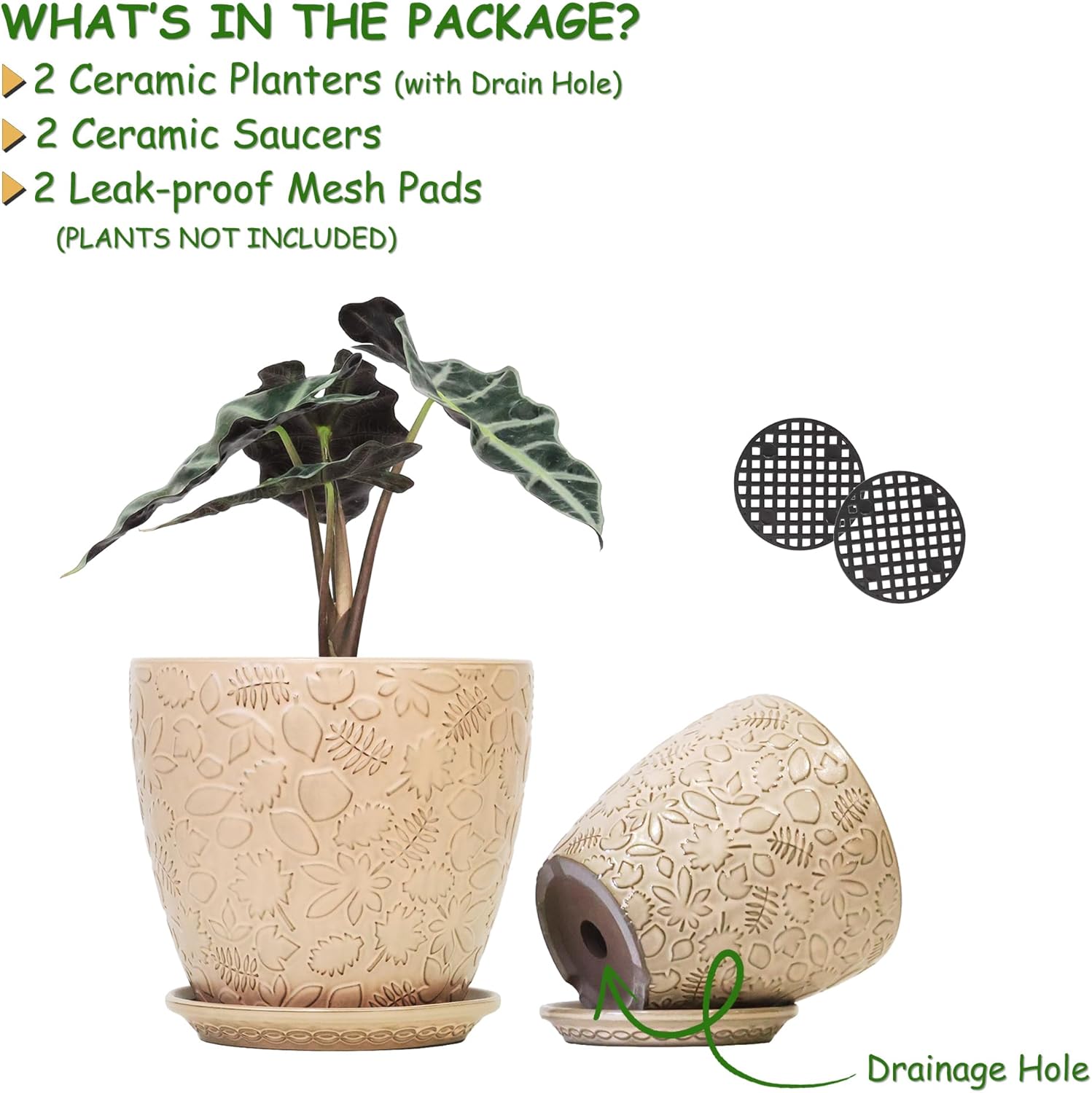 - Size & Package: 8.0 Inch Pot & 6 Inch . Package: contains 2 ceramic flower pots, 2pcs mesh pads and 2pcs saucers(NOT INCLUDE PLANTS)