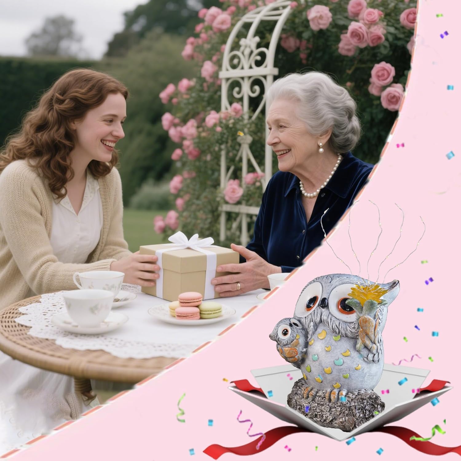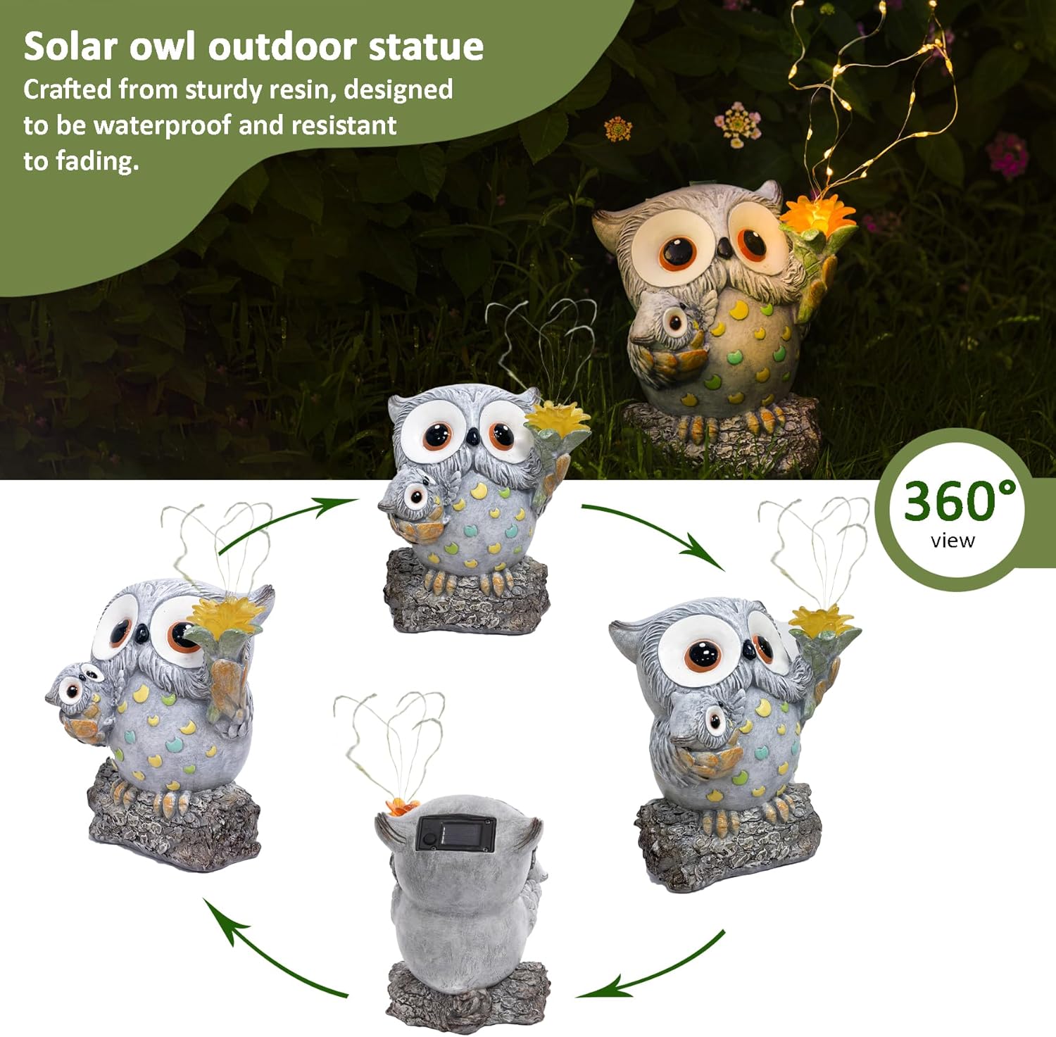 - Funny Owl Garden Statues: Charming owl decor shows a mother owl holding her baby while standing on a tree branch, gently shining a lantern toward the sky as they gaze at the stars. This heartwarming scene is full of childlike wonder. Perfect garden decorations for patios, porches, yards, balconies, fences, or walkways. A magical touch to your outdoor garden decor.