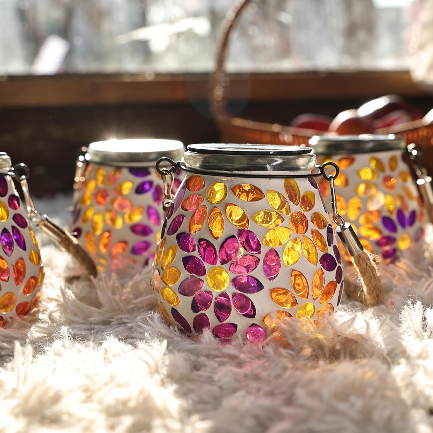 Cooo 4 Pack Mosaic Solar Lantern Outdoor Waterproof IP68 Hanging Projection Light Hidden Lid Pear-Shaped Lantern with Rope Handle Solar Powered Auto On for Patio Garden Fence Table -Petal Mirage
