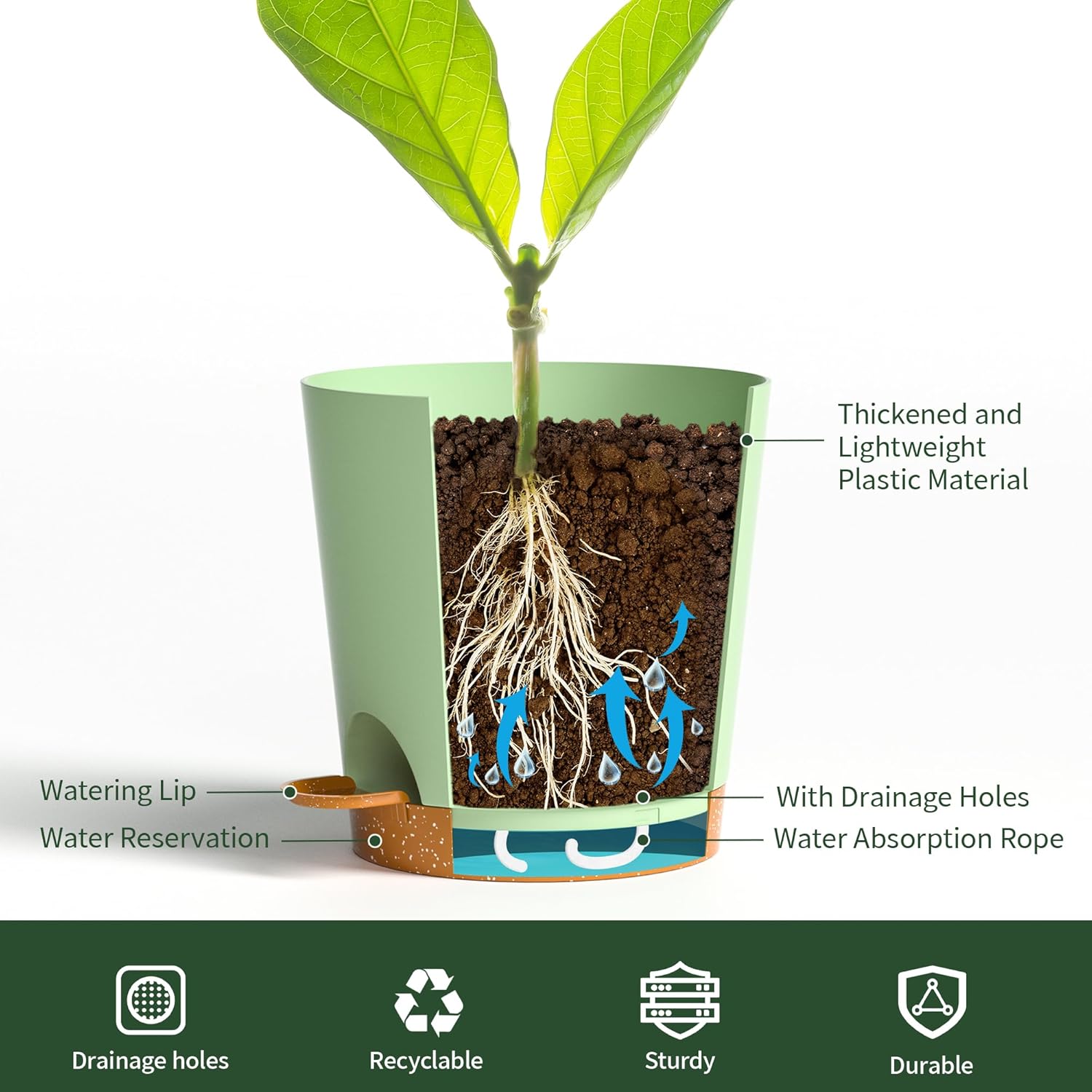 - Self-Watering Planter System: Our 4 inch small self watering plant pots feature a built-in wick rope that draws water from the reservoir, ensuring consistent hydration for your indoor and outdoor plants. Perfect for busy plant owners and those who forget to water!
