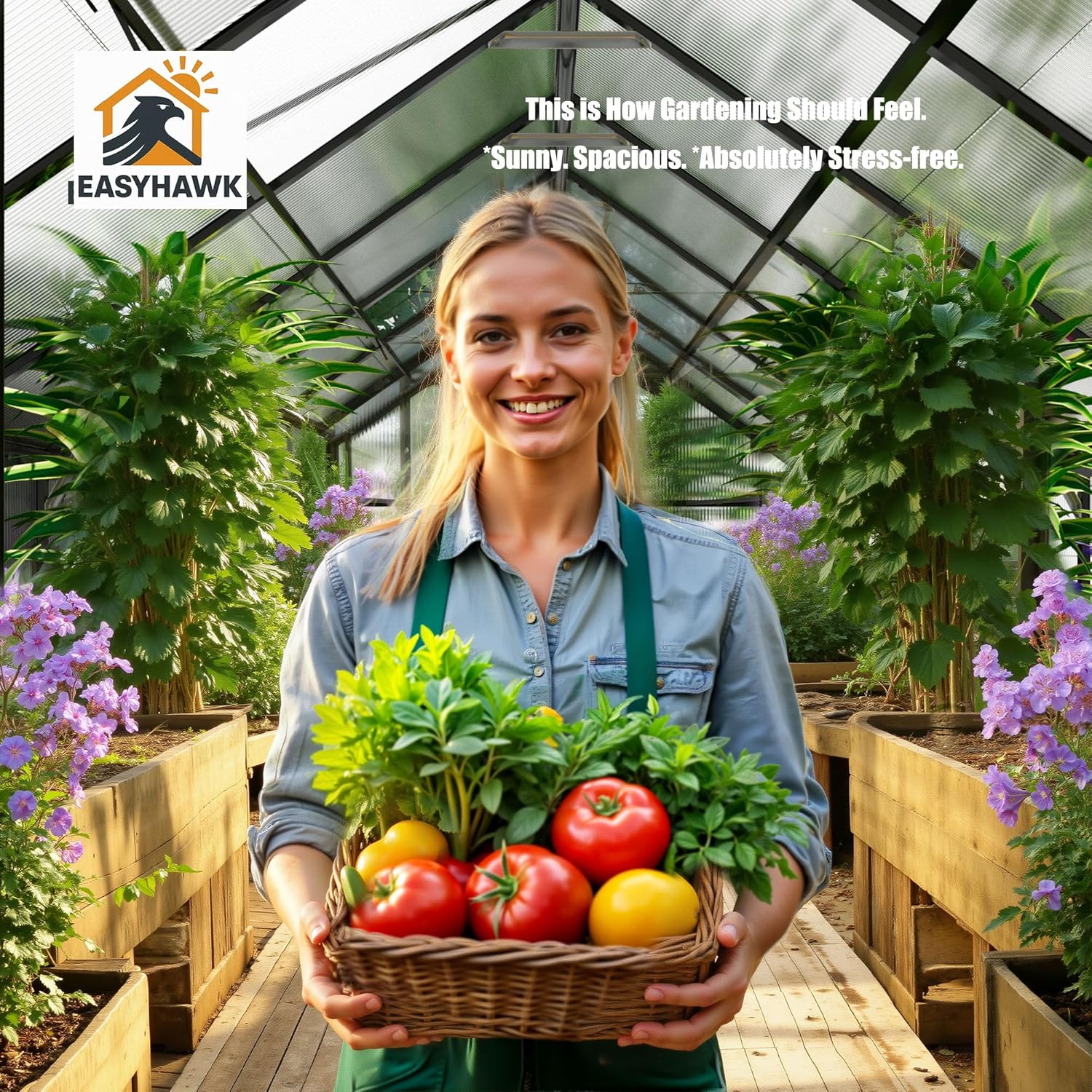 - 【All-Weather Durability】Built to resist heavy rain, strong winds, and harsh sun, this greenhouse keeps plants safe year-round. Features premium 720g/m² polycarbonate panels and a rust-proof aluminum frame—sturdy, lightweight, and long-lasting.