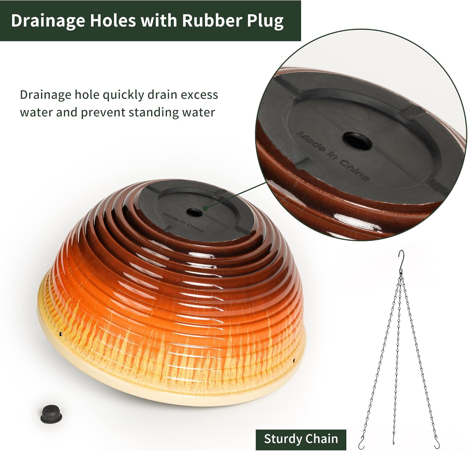 12 inch Large Hanging Planters for Indoor Outdoor Plants, Set of 2 Glazed Hanging Flower Pots with Drainage Hole, Hanging Baskets for Garden Home Porch Decor
