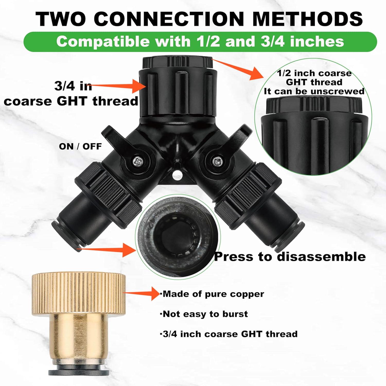 - 【Upgraded Plant Watering System】The faucet quick connector is made of copper, and the threads are 3/4 inch coarse GHT thread,Which is designed for US market use. You don't need to purchase additional equipment to connect the hose. The “Y ”type water distributor enables you to easily suit the unique layout and needs of your garden. Besides,The kit include a bag of fixing nails,a bundle of cable ties, galvanized rust-proof U-shaped garden stakes, which can meet the needs of ground, fence or elevated flower bed. This drip irrigation kit is the best choice for Courtyard watering, roof cooling systems, lawn care and flower bed irrigation.