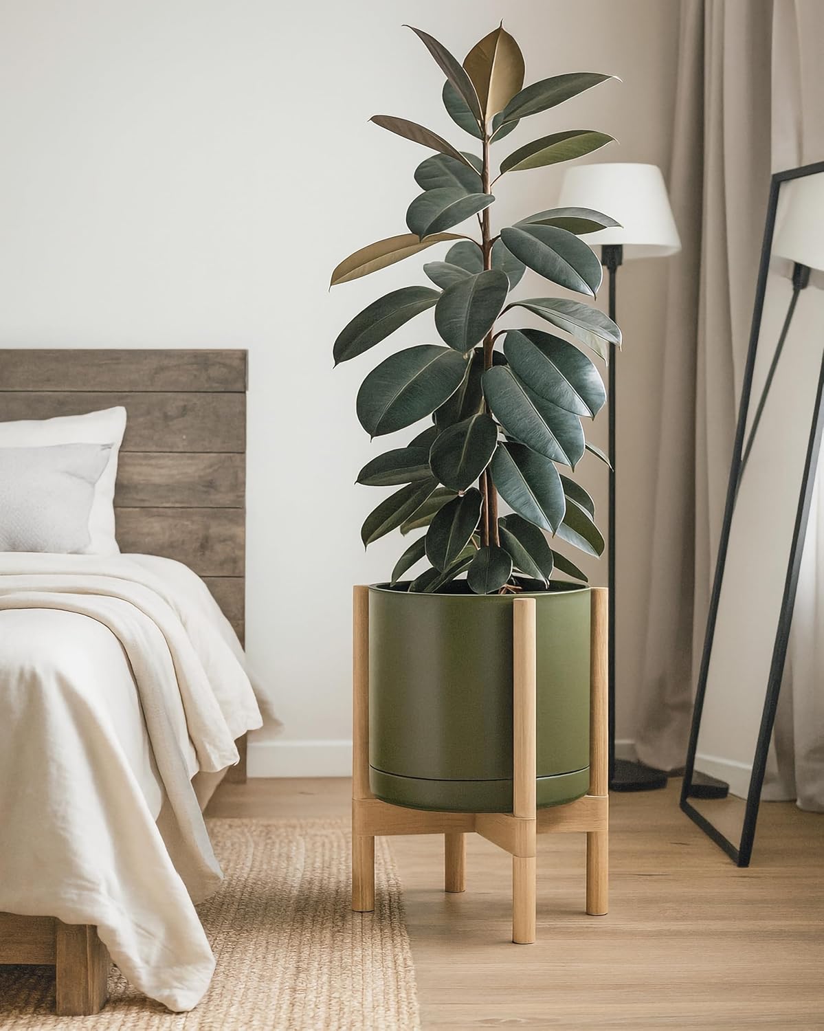 D'vine Dev Ceramic Planter with Natural Stand - 12 Inch Modern Round Flower Pot with Wood Planter Holder, Olive, 55-B-J-J