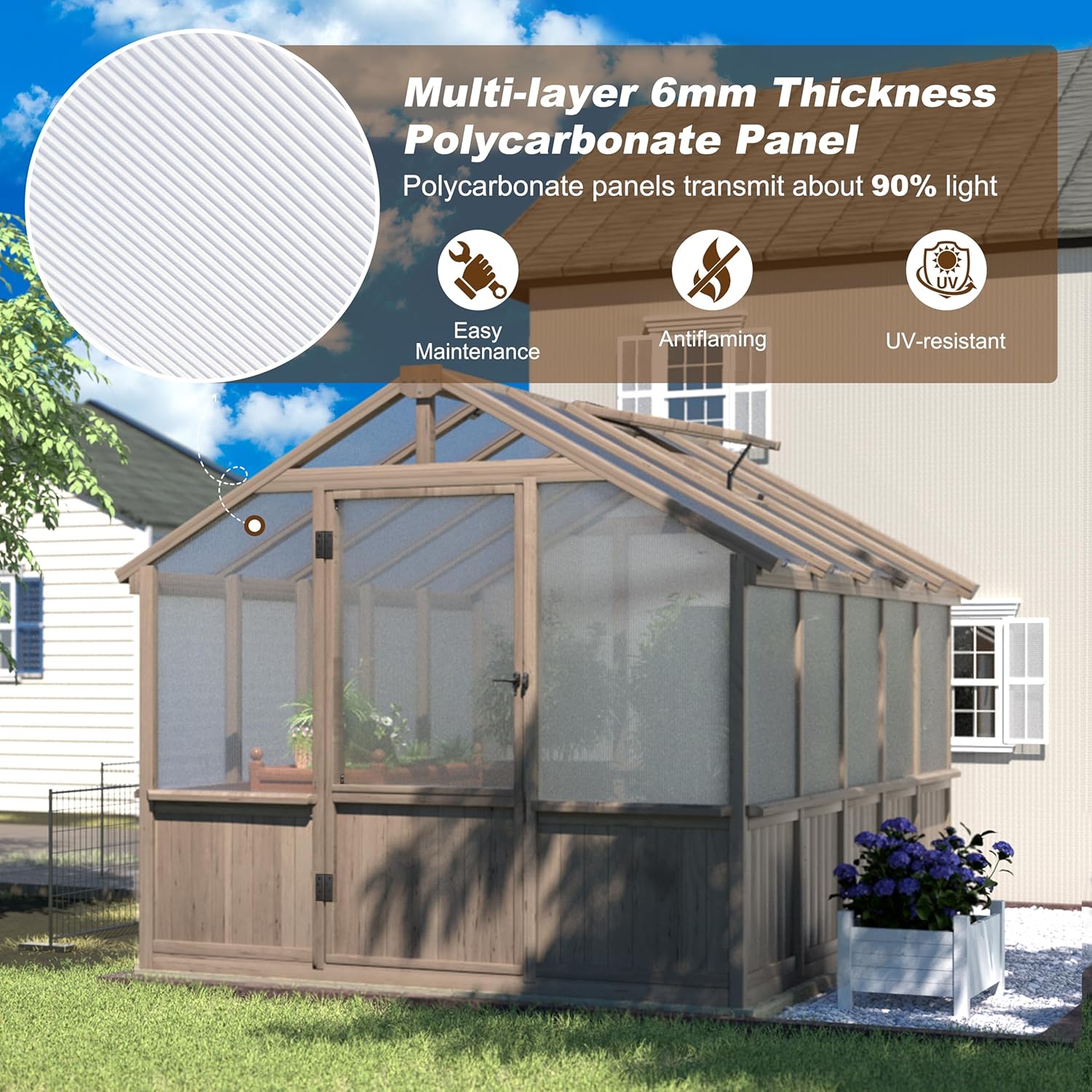 - Upgraded Polycarbonate Panel: Yardenaler greenhouse kit uses multi layers polycarbonate panel to provide high light transmission and UV protection. They allow light transmission for plant growth while blocking over harmful UV rays which is beneficial for the better growth of your plants
