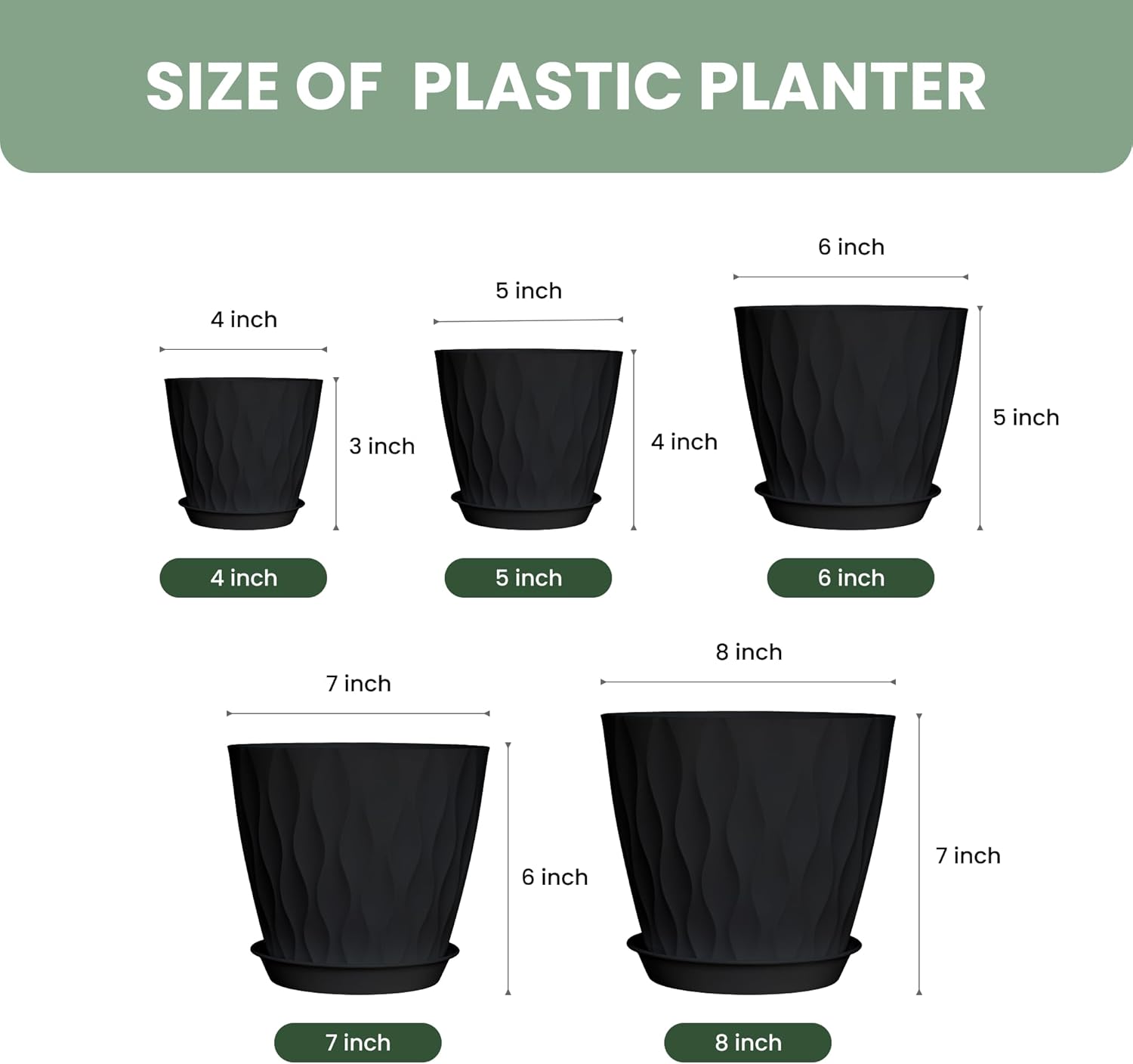8/7/6/5/4 Inch Plant Pots with Drainage Holes, Setof 5 Plastic Planters for Indoor Outdoor Plants,Indoor Flower Pots, Nursery Planting Pot for Garden OfficeHome Decor(Black, 8/7/6/5/4)