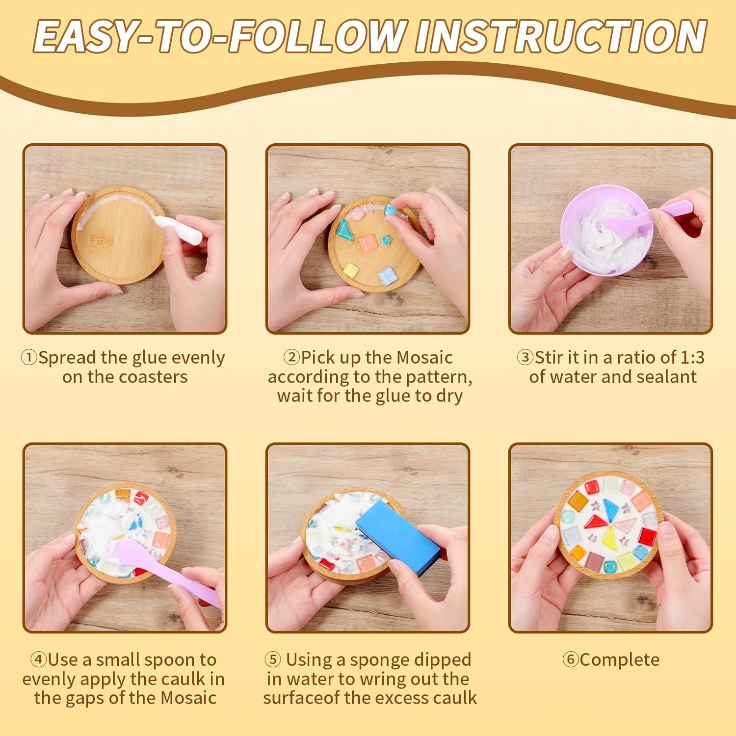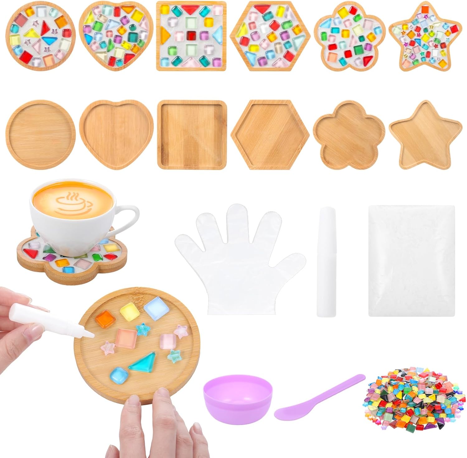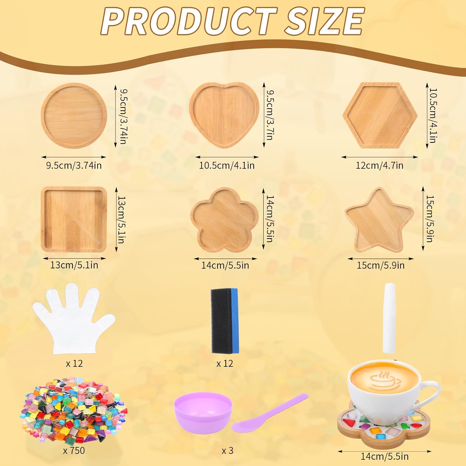 - Complete DIY Mosaic Kit: each DIY glass mosaic tiles for crafts package includes 12 wooden coasters in 6 different styles, about 850 colorful mosaic accessories, 12 glue, 12 sponge brush, 12 pairs disposable gloves, 3 sets of bowl and 500g caulk; This kit ensures you have everything needed to start your DIY mosaic journey
