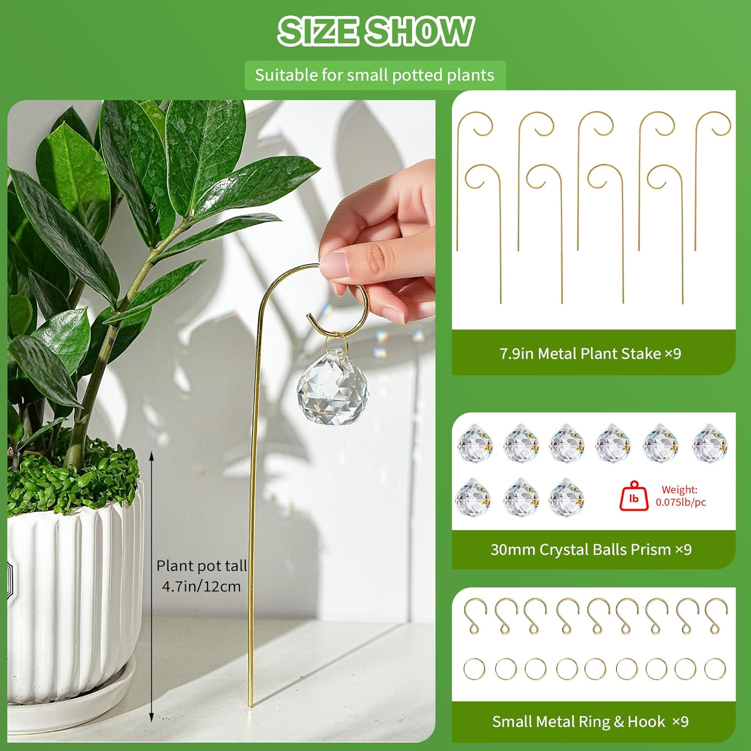 - Crystal Suncatcher Plant Trellis: Comes with 9pcs 30mm crystal ball prism and sturdy gold trellis – simply place the trellis in your pot and hang the prism