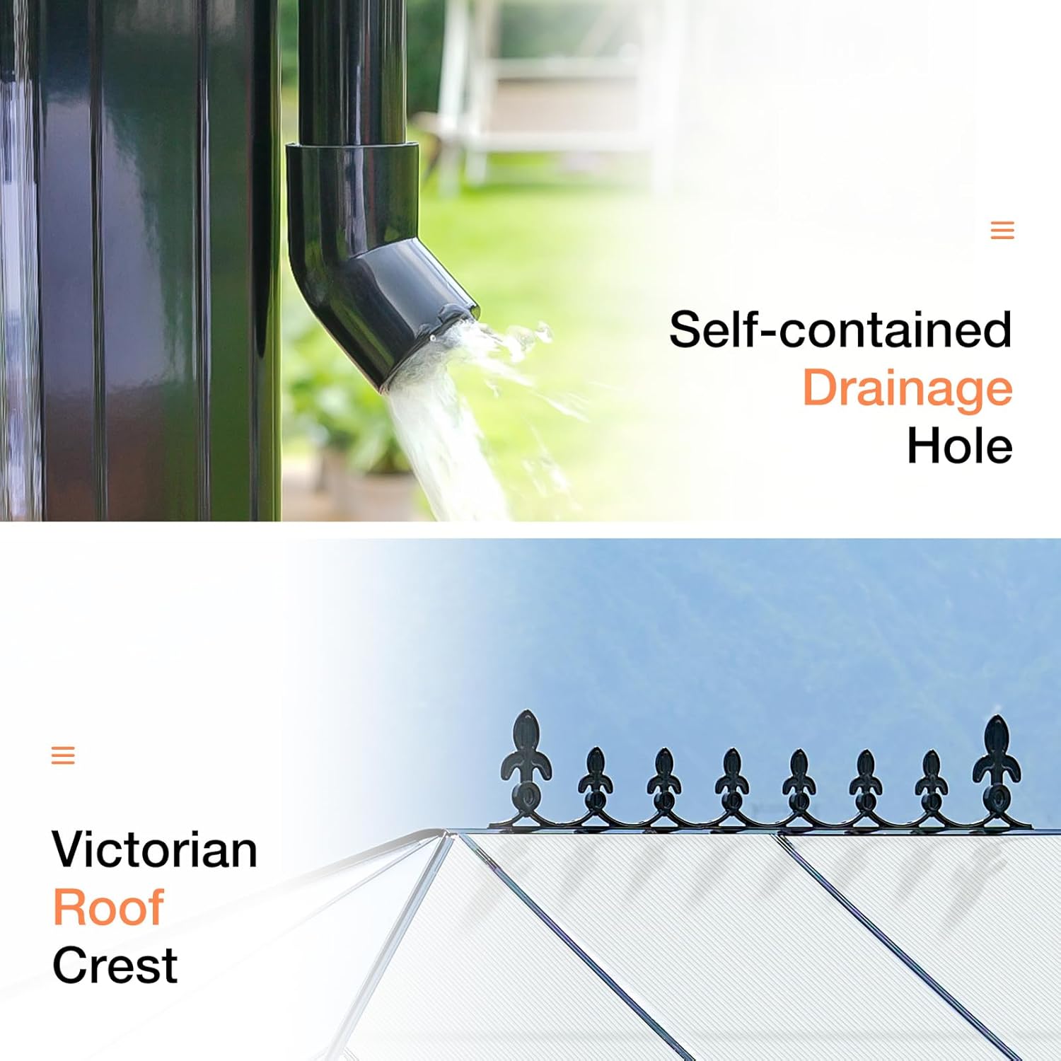 - Walk-in Greenhouse for Better Ventilation: 4.4 FT wide double swing doors (with door hooks) for easy entry to dozers and people. 2 adjustable side vents for air convection. A Victorian roof crest design is added on the top