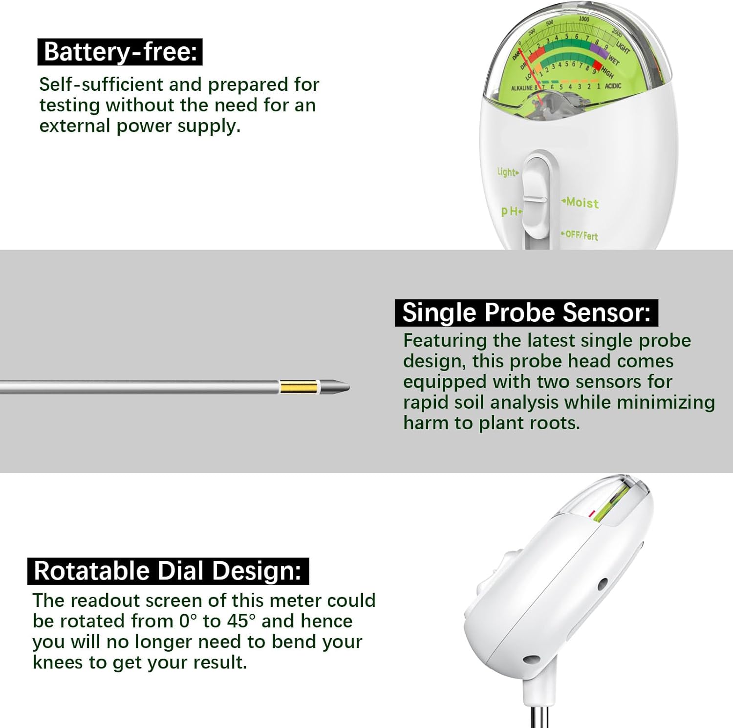 4-in-1 Plant Soil Tester with pH, Moisture, Fertility & Light Meter, Rotatable Dial Soil Test Kit, No Battery Required for Garden, Lawn, Farm, Indoor & Outdoor Plants, White